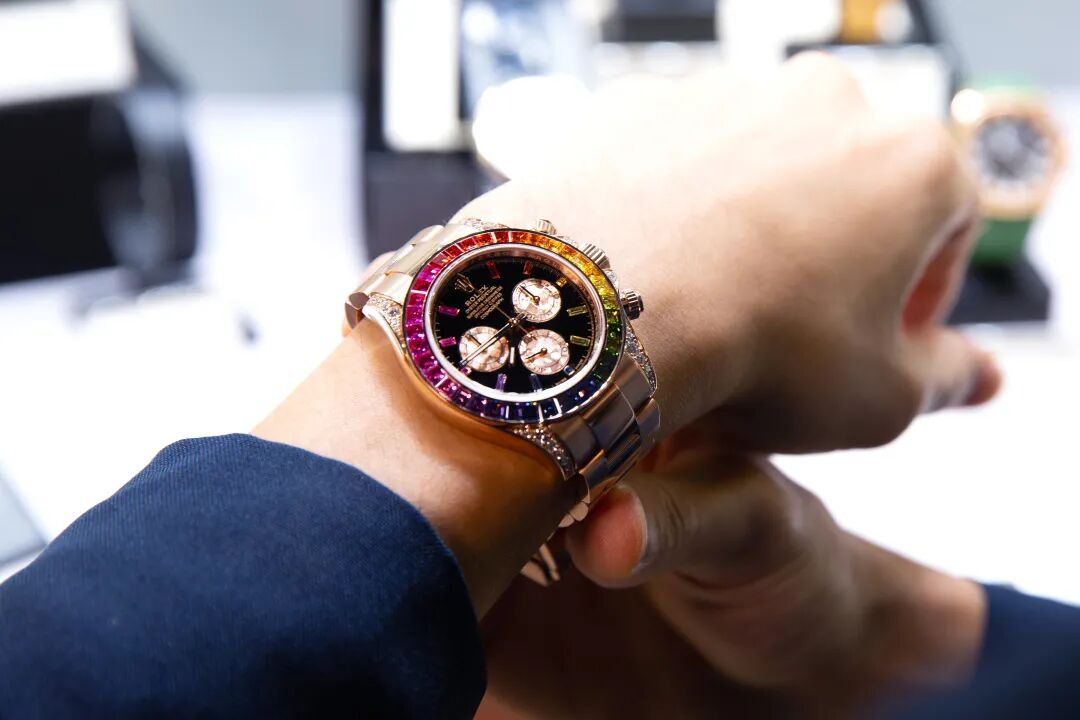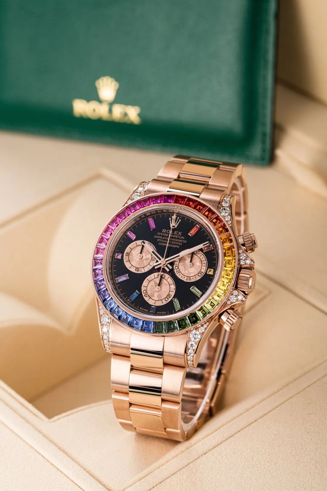 非常精美罕有,全新玫瑰金镶钻石及彩色宝石自动链带计时码表,“Cosmograph Daytona Rainbow”,型号116595RBOW,年份约 2021,附原厂维修书及表盒