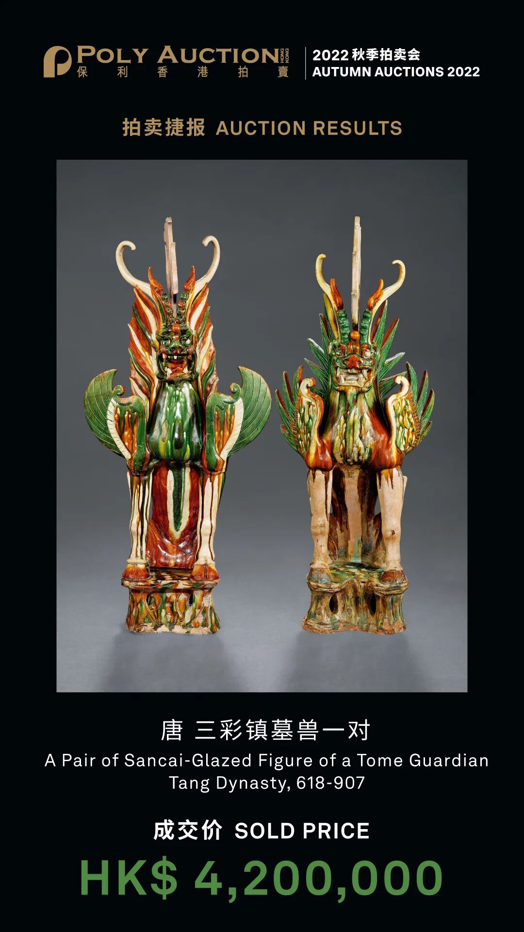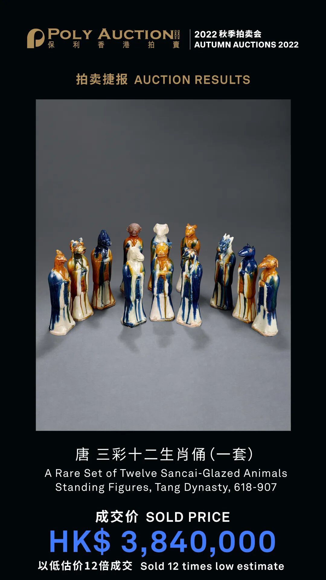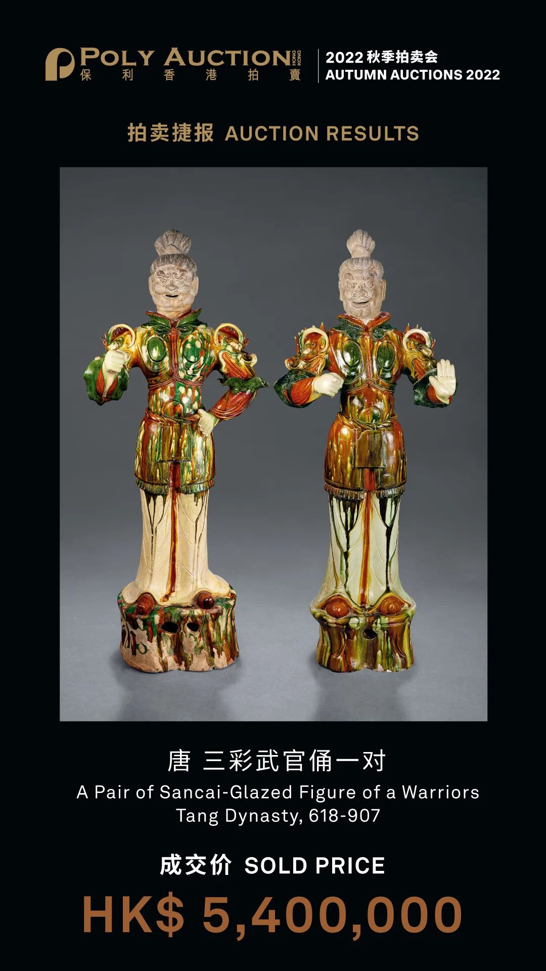 唐三彩武官俑一对荣膺本专场最高额拍品,以低估价 3 倍的价格,港币 540 万元成交,创历年第二高价唐三彩拍品。同场亦有多件拍品掀起场内、线上及电话委托三方的激烈竞投,当中,唐三彩十二生肖俑一套战果尤为亮眼,最终以逾估价 12 倍之港币 384 万元成交,唐蓝釉烛台亦取得佳绩,最终以逾估价 10 倍之港币 216 万元成交;专场封面作品唐彩绘连体侍女陶俑,则以港币 132 万元成交,以低估价 4 倍成交。
