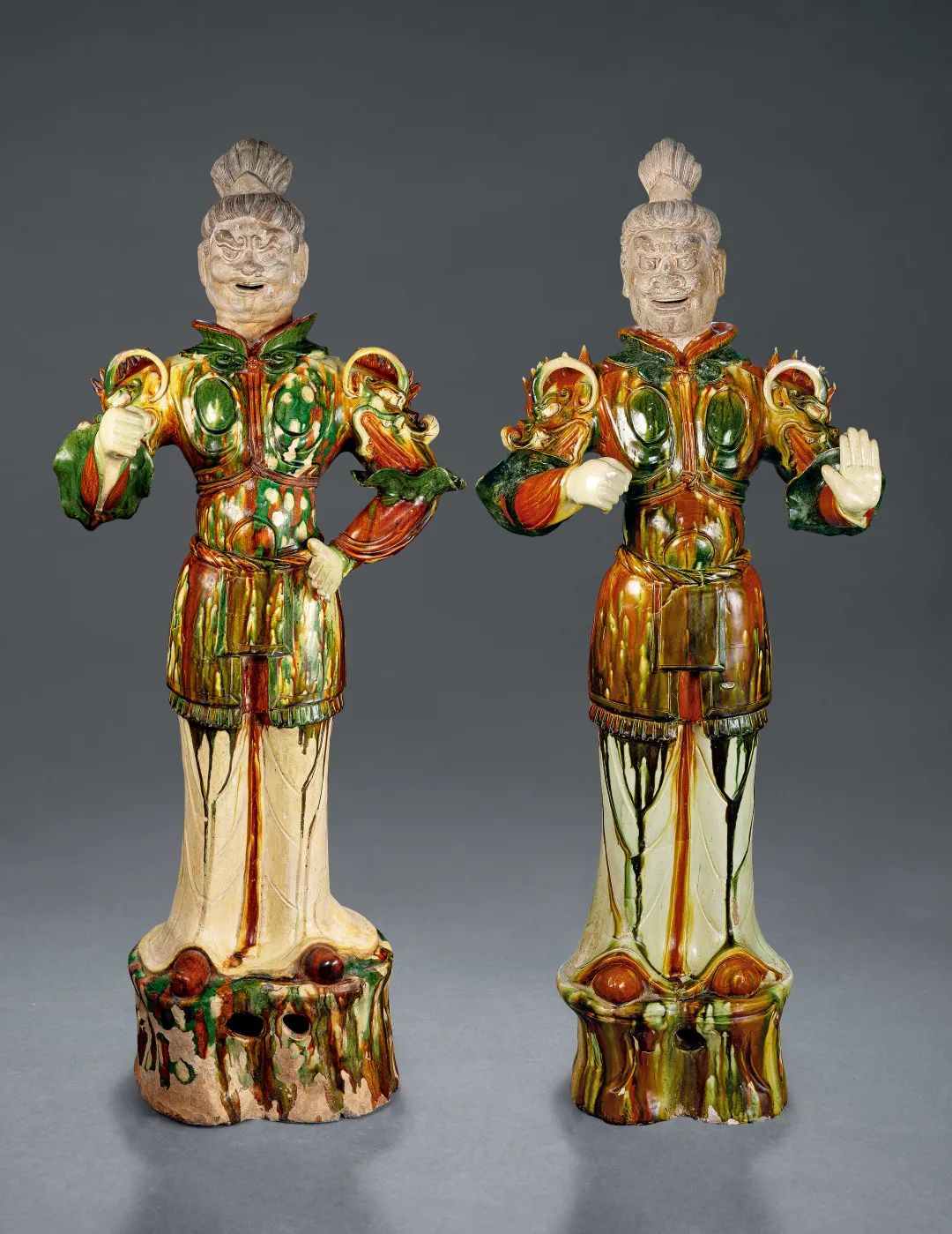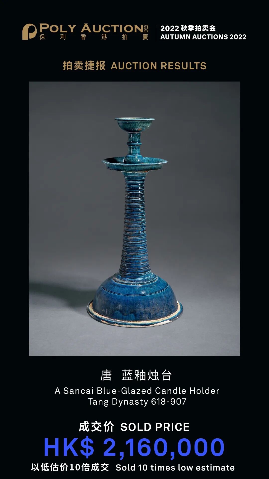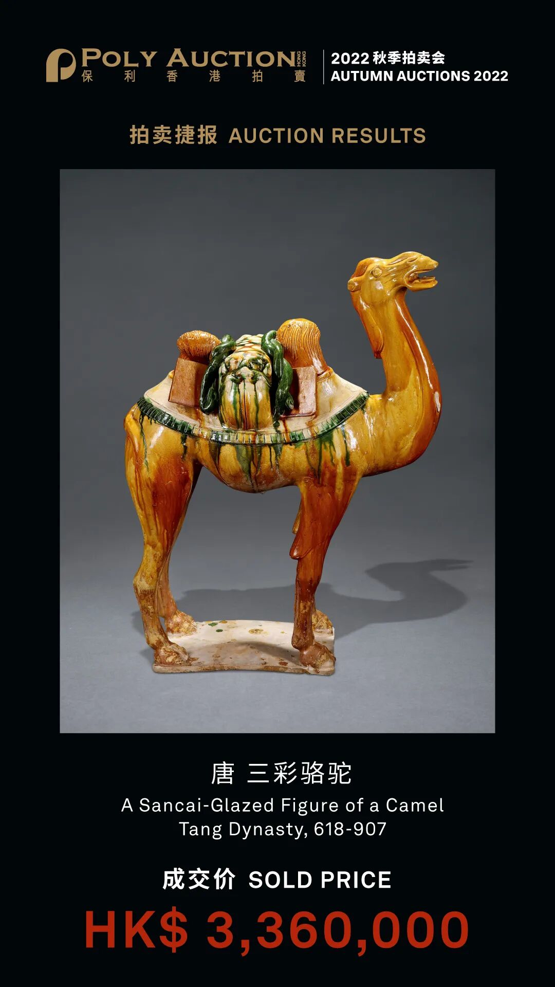 唐三彩武官俑一对荣膺本专场最高额拍品,以低估价 3 倍的价格,港币 540 万元成交,创历年第二高价唐三彩拍品。同场亦有多件拍品掀起场内、线上及电话委托三方的激烈竞投,当中,唐三彩十二生肖俑一套战果尤为亮眼,最终以逾估价 12 倍之港币 384 万元成交,唐蓝釉烛台亦取得佳绩,最终以逾估价 10 倍之港币 216 万元成交;专场封面作品唐彩绘连体侍女陶俑,则以港币 132 万元成交,以低估价 4 倍成交。