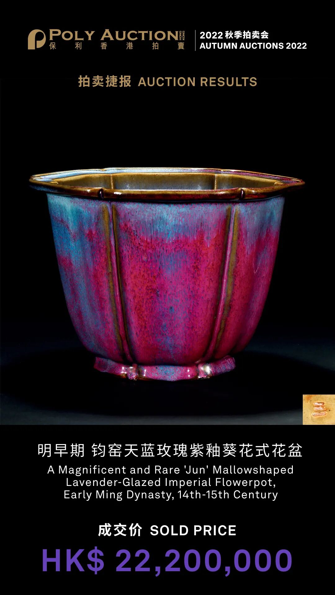 中国古董珍玩两大专场于今天圆满收槌,总成交额近港币 1.2 亿元,拍卖首天即取得璀璨佳绩。本次秋拍重磅拍品明早期钧窑天蓝玫瑰紫釉葵花式花盆以港币 2,220 万元成交,为中国古董珍玩部本季最高价拍品。拍品来源显赫的「花舞大唐:北美十面灵璧山居珍藏唐代艺术珍品」为唐三彩拍卖的第二部分,总成交额达港币 4,360 万元,落槌总额为拍前低估价 186 %,全场成交率高达 94 %,近五成拍品成交价逾拍前高估价成交。