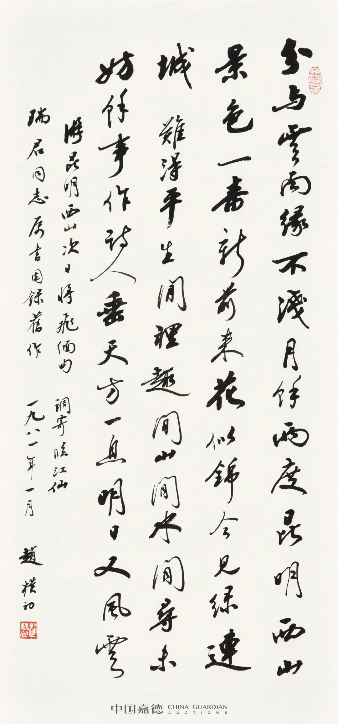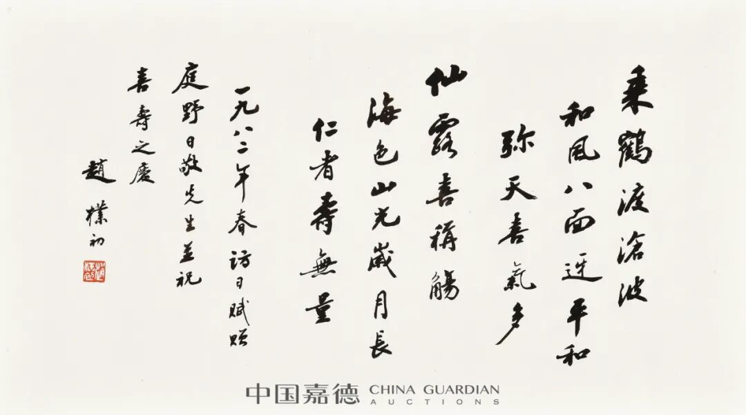 2021年中国嘉德秋季拍卖会“笔墨文章——信札写本专场”设有赵朴初书法专题,内收赵朴初行书“海月楼”、“宝珍阁”、自作汉俳、各言楹联、华严经偈、题地藏菩萨九华垂迹图、自作词调寄临江仙等,朴老所结佛门善缘及素日闲情雅趣跃然纸上。