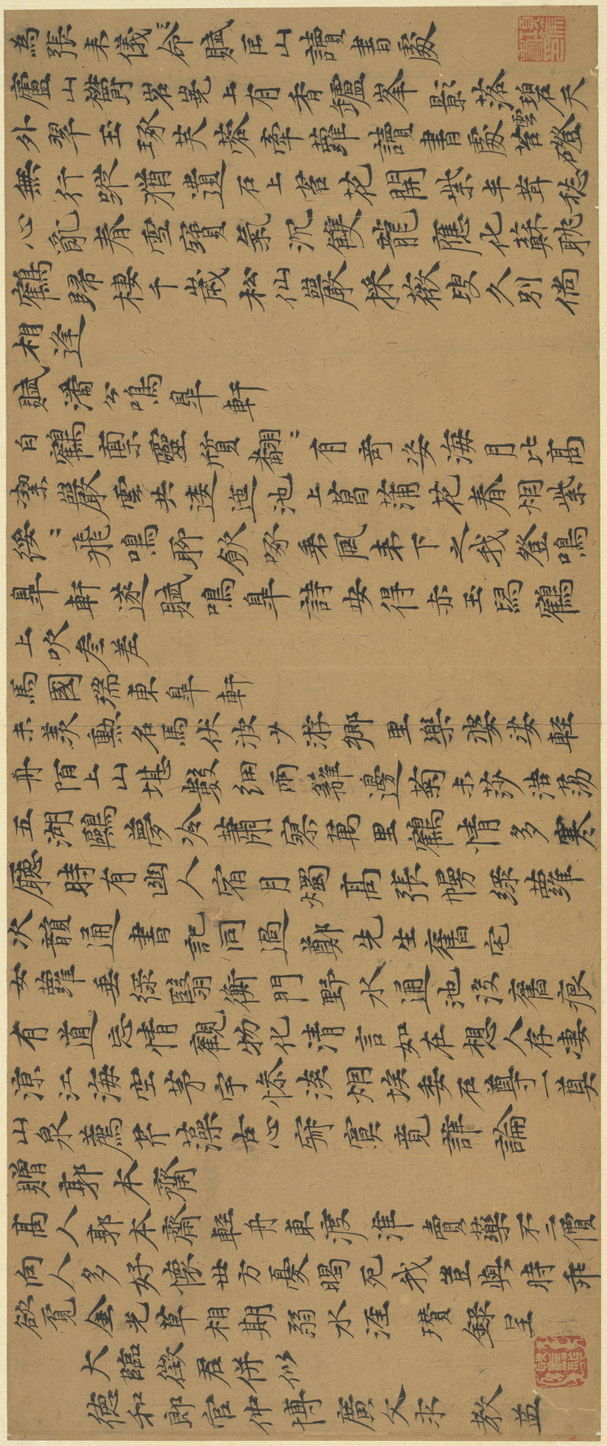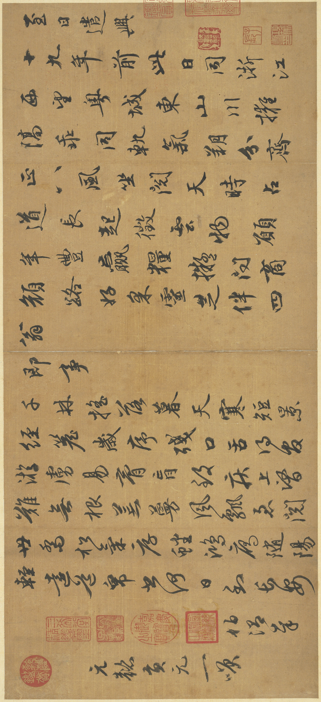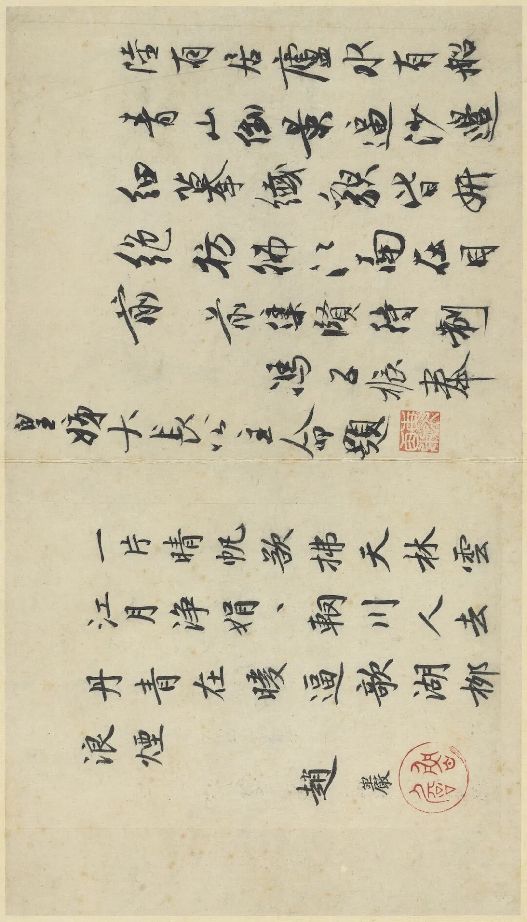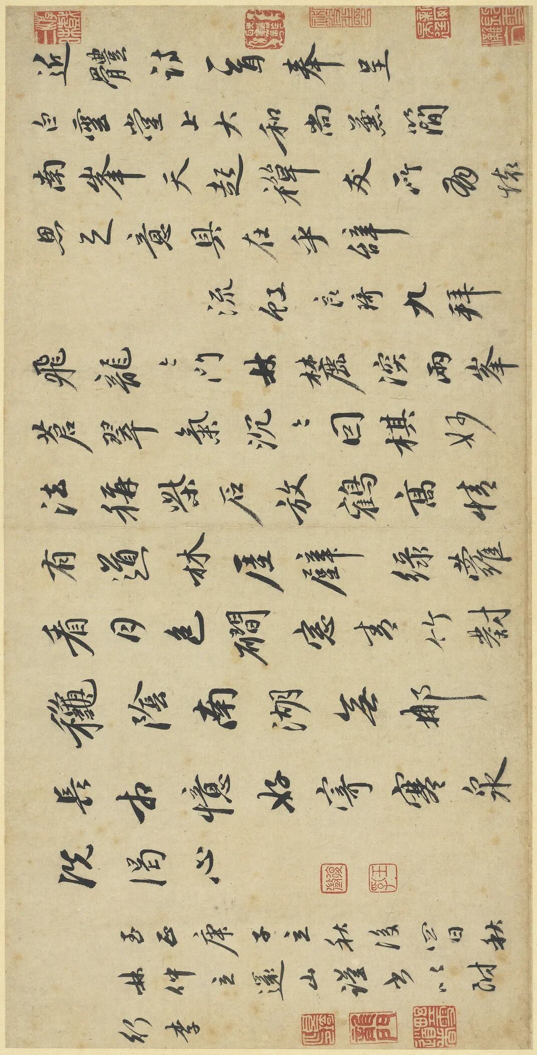 近体诗一首奉呈白云堂上大和尚兼简南峰天起禅友。所有怀思之意具在乎辞。流虹良琦九拜。飞龙龙门林麓深。两峰苍翠气沉沉。因棋妙法称柴石。放鹤高情有道林。崖壁绿萝看月色。涧窗青竹对秋阴。南湖无那长相忆。好寄寒泉洗渴心。至正庚子(1360)立秋后四日。秋林仲立还山。谨书以附行李。