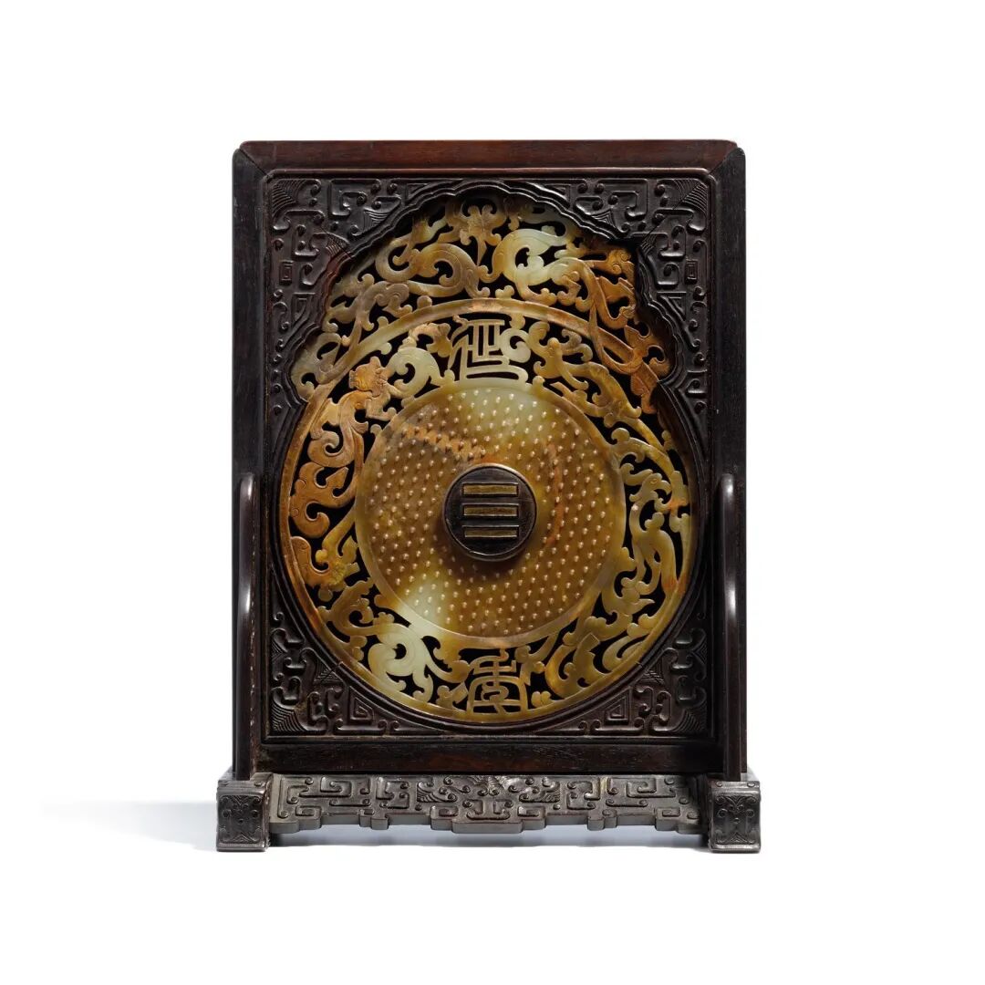 東漢/清乾隆 御賞嵌「延年」龍鳳紋璧紫檀插屏 《乾隆庚寅孟春月御題》、《乾隆庚寅御題》款「古香」、「太玉」、「乾」、「隆」印