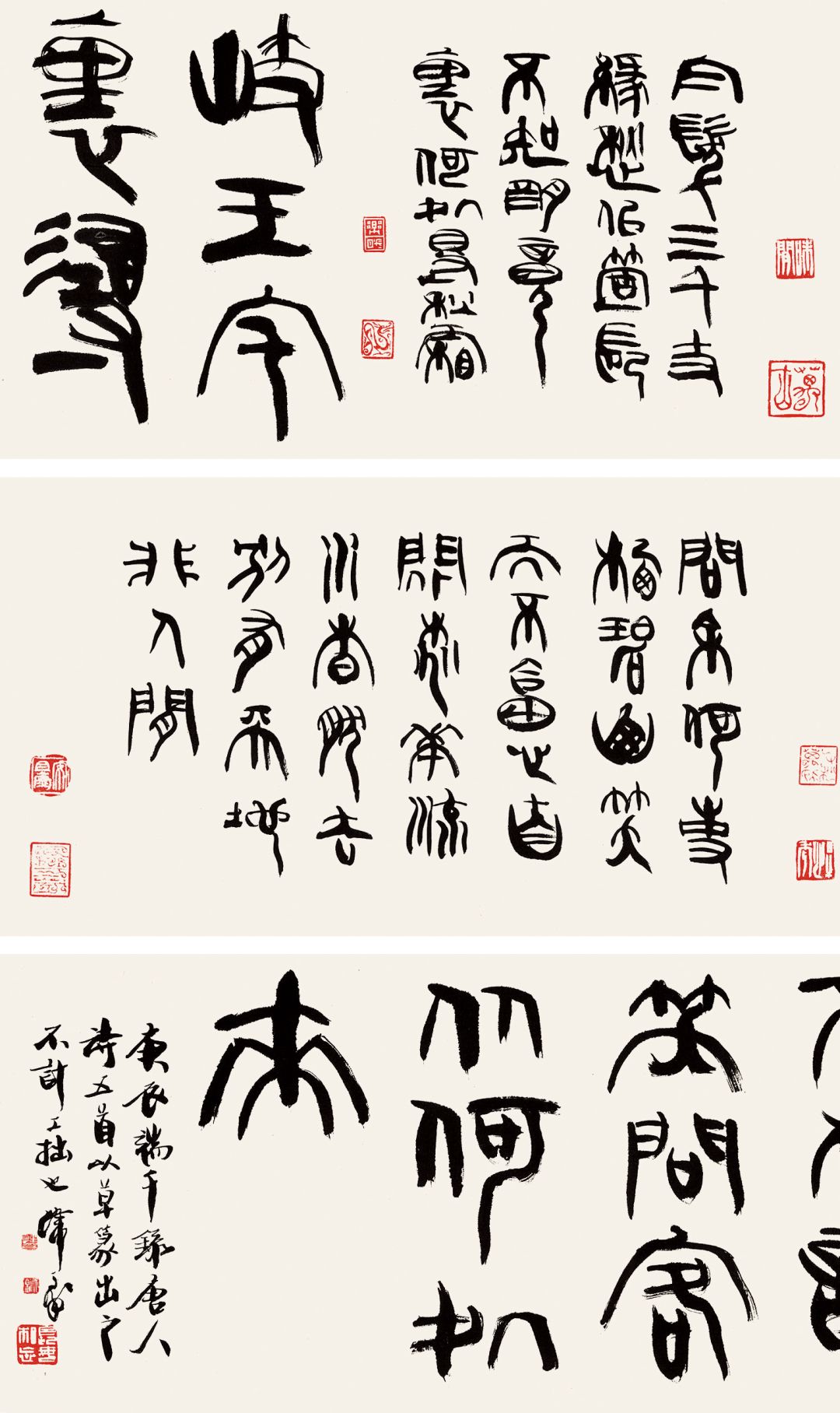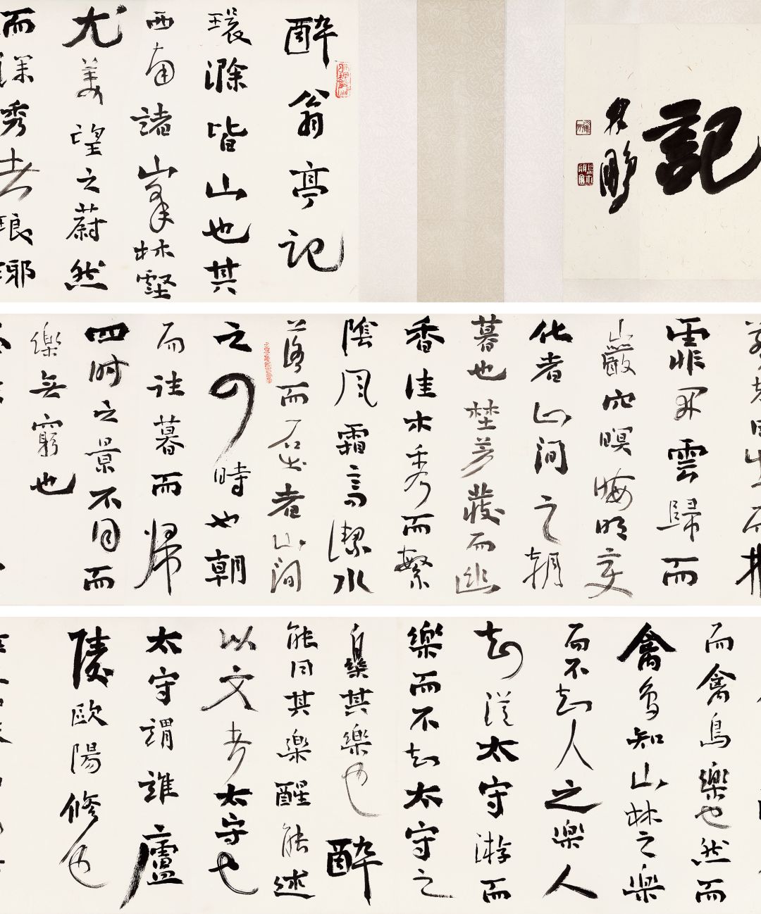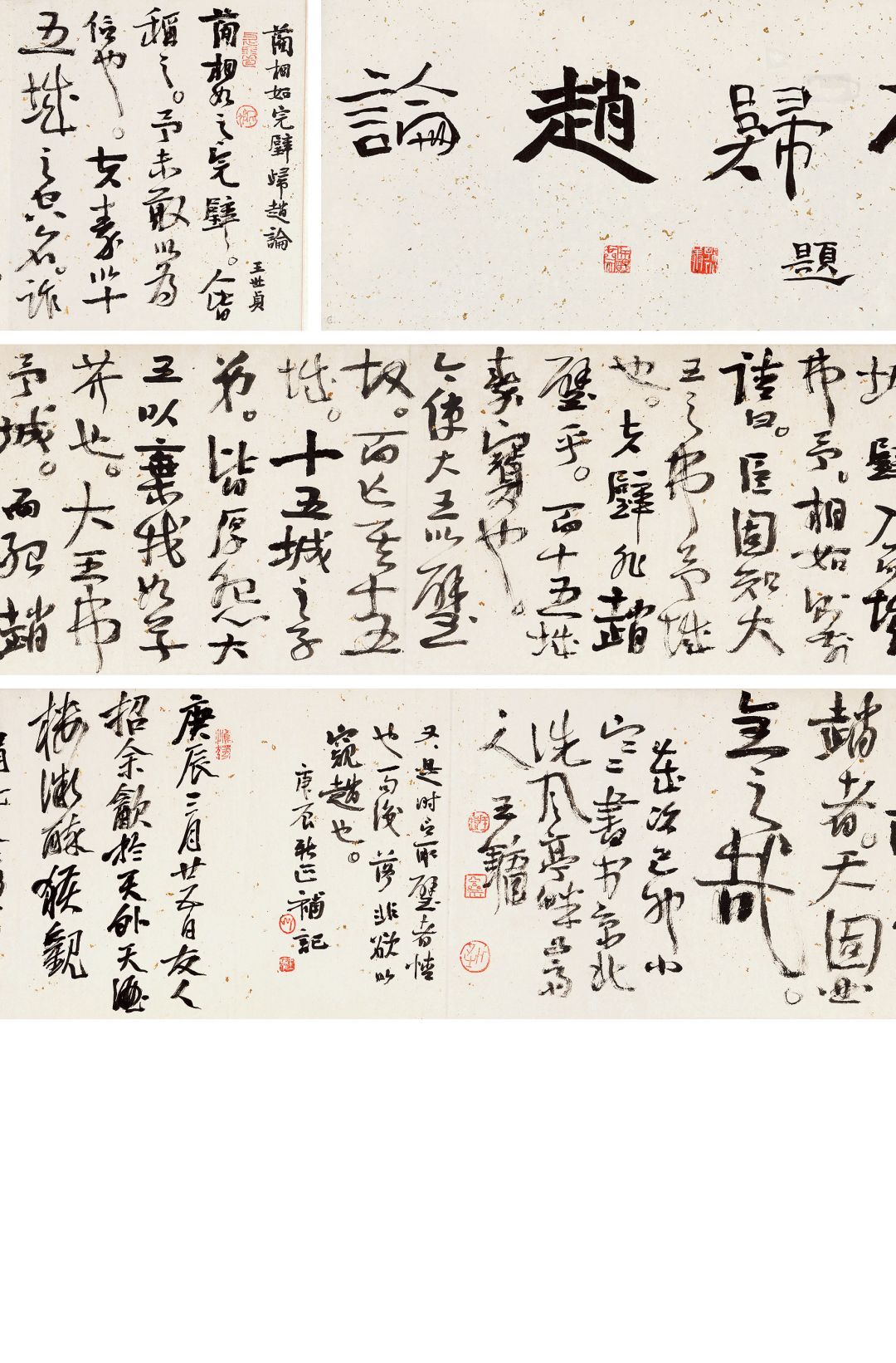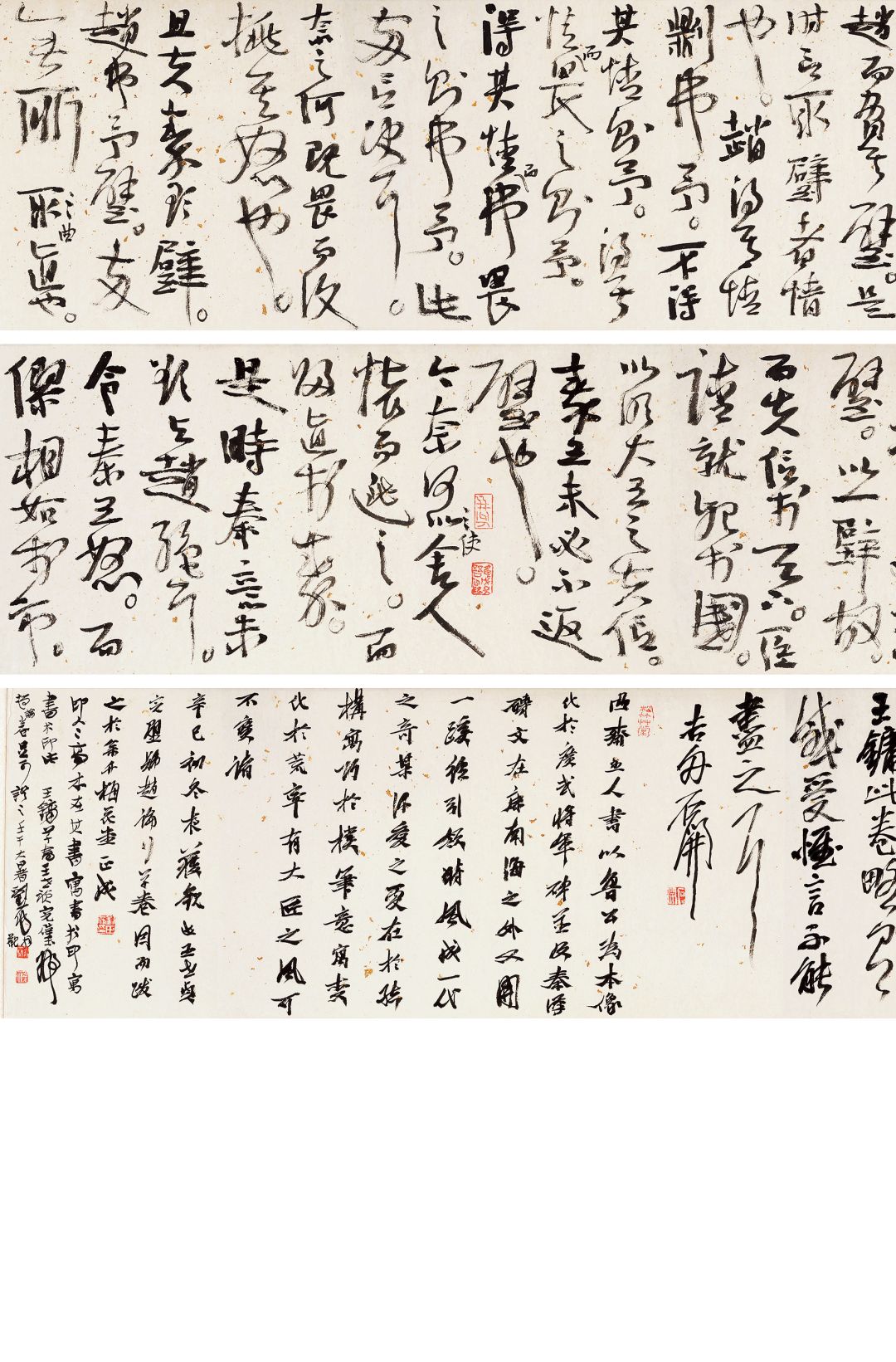 书法创作脱离书写功能,追溯其渊源,开始于尺牍,随着书写需要和纸张等客观条件的发展,逐渐依托于手卷。或者说只有到了手卷的出现,在尺牍基础上酝酿发展起来的大篇幅文字的有意书写,才是书法创作时代到来的标志。譬如王羲之的《兰亭序》、颜真卿的《祭侄文稿》。唐代张旭和怀素在有限的尺牍和手卷空间里大胆创想,奋笔疾书,奔腾缠绕,实现了书法艺术在手卷美学追求上的疯狂和极致。书法手卷开阔了书写的横向空间,让书写从日常交流到艺术创作成为意识上的自觉,形成未来独有的艺术表现形式。当下随着毛笔应用逐渐脱离生活,书法创作给我们提出了更多的挑战和要求。如何真切的运用笔墨表达情感,或者说如何利用传统固有形式进行笔墨书写,成为突破自我体现书写水平和审美价值的新问题。保利拍卖第52期书画精品拍卖有幸接受某书法爱好者之委托,为藏家呈现由其在上世纪九十年至本世纪初,专门请当代书法名家包含沈鹏、孙伯翔、王镛、韩天衡、石开、王友谊、何应辉等以巨幅手卷进行创作的多件作品。此中部分手卷长度达到6米余,且涉及书家之众,书体之全,水平之高,形式之统一,为近年市场罕有。沈鹏“草书望海潮词卷”,词阙内容为作者1999年访美观尼加拉大瀑布有感而作,手卷为其在2000年应索者请求付诸笔墨。这是作者将诗词创作与书法相结合的难得力作。作品纵33厘米,横390厘米,洋洋洒洒近200字。诗词内容藏情于景,情中含景,意无穷尽。书法如蛟龙飞舞、河海奔腾,展卷阅读,如亲临大瀑布之震撼心灵。王镛作为当今富有独立见解和开拓精神的艺术家,在诗、书、画、印四方面都取得了较高的成就。本场“草书《完璧归赵论》卷”,长度达到6米余。此内容虽为前人所著,但全篇以王镛特有的现代书体重新书写,以作者自己对内容的理解进行了再次创作,全篇集合印章的使用,并孙伯祥题引首、石开、刘正成、王友谊跋,集各家书体为一堂,令手卷成为当代书法收藏、研究难得巨制,也是王镛本人少有付诸如此心血的手卷书法创作。同样为6米余长卷孙伯翔“行书醉翁亭记”,书体形散神聚,气质不凡。整片节奏清新明快,书写中注重用笔变化与内容的结合,可谓执笔于手,巧悟于心之典范。韩天衡“草篆唐诗五首”、王友谊“金文书前出师表”,以自己对金文、篆刻之理解,将不同解体、结构等表达在书法创作之中。石开“行书江湜龙岩州除夕诗卷”和何应辉“行书自作诗卷”则将作者对书写的乐趣融入其中,展卷读来,让人慢慢体会笔画游走带来的韵律和美感。