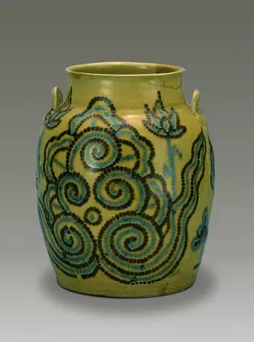 1974年扬州市唐城遗址出土。罐直口,卷唇,高颈,鼓腹,平底。肩部置对称扁环形双系,系上饰云纹和“王”字。胎为米黄色。通体施青黄色釉,器身布满纹饰,以褐、绿两色相间的大小斑点组成连珠状卷云图案,每组之间绘莲叶和莲花纹。其形体之大、纹饰之精、釉色之美,是长沙窑罕见的珍品。