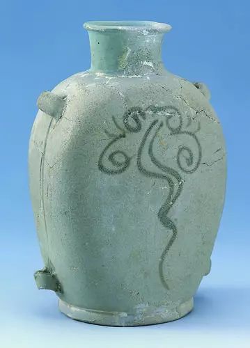 1980年出土于扬州东风砖瓦厂唐代土坑木棺墓中。壶唇口微撇,直颈,溜肩,橄榄形扁平腹,平底。壶身两侧各有双耳,为背水穿带用。壶身通体施青绿色釉,一面用绿彩绘有长脚花云气纹,一面用绿彩书写古阿拉伯文“真主最伟大”铭文。此壶的造型、铭文和纹样具有浓郁的西亚风情,而壶的产地在中国长沙窑。这是一件反映唐代中西文化合璧的重要信物。