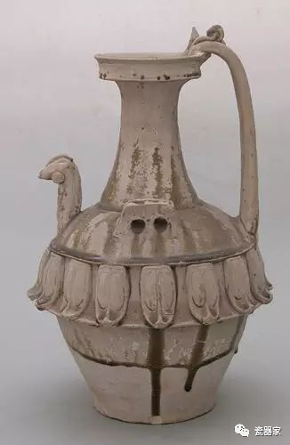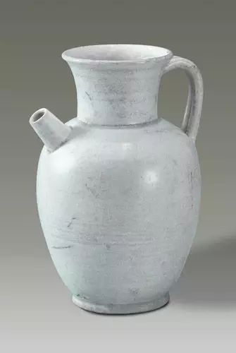 1975年扬州市东风砖瓦厂出土。壶喇叭形口,高颈,斜肩,长圆形腹,腹下部渐收敛,饼形足而底平,颈、肩之间置复合环形柄,相对应处置圆形短流。壶胎骨坚致,修胎规矩,造型端庄,在胎与白釉之间施有护胎釉。此壶系河北省邢窑精品。