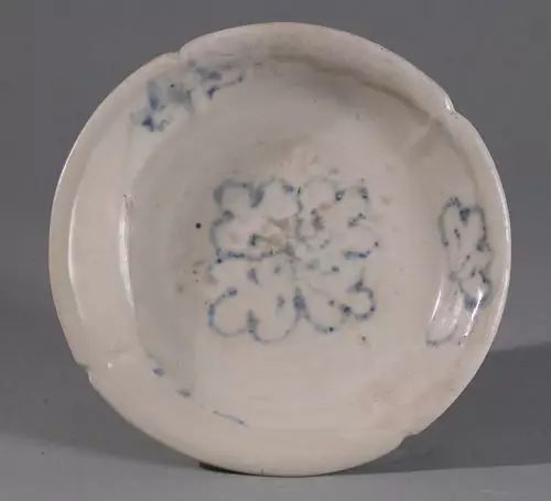 1995年扬州市三元路工地出土。四花瓣形口,圈足,足端露胎。釉下施化妆土。釉色白中泛奶黄,微开碎片,青花发色较好,有深色斑点。沿口绘有云纹,器心绘一朵团花,四面延伸各绘4朵团花。唐青花迄今发现较少,此盘造型、纹饰皆具唐代典型风格,尤为珍贵。
