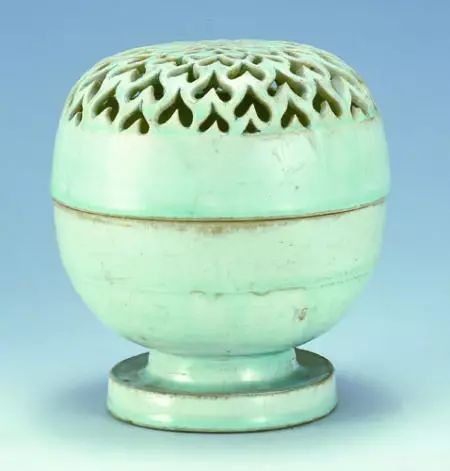 该器为传世之物。熏为上下对合的球形,熏盖布满“火焰状”镂孔,以子母口与熏体结合,熏体中腹有一道凹状弦纹。底座束胫,高圈足,平底。胎质坚密白细。器内无釉,器外满施青白色釉,釉色莹润如玉。此熏器形美观墩实,为实用器。