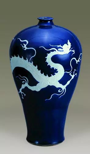 1984年从扬州市文物商店收购。梅瓶口小,颈短,肩丰,肩以下渐收,至近底部微外撇,浅底内凹。通体施霁蓝釉,云龙、宝珠施青白釉,两种釉色对比鲜明、强烈。主纹刻划一条龙追赶一颗火焰宝珠,并衬以4朵像浮动的珊瑚枝一样的火焰形云纹。巨龙威武、悍猛,颇有叱咤风云之势。在国内外收藏的3件元代霁蓝釉白龙纹梅瓶中,此瓶器形最大,造型秀挺,釉色净润,纹饰精美且又生动活泼,气势磅礴,堪称梅瓶中的极品。