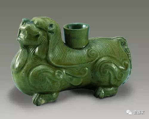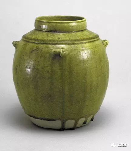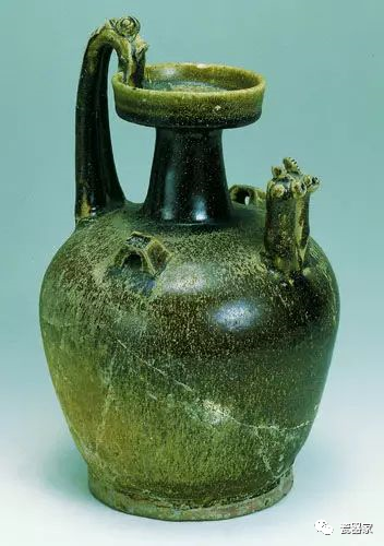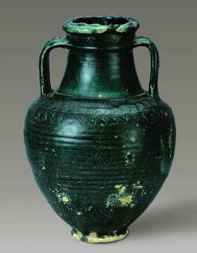 1965年扬州市汽车修配厂出土。唇口,高颈,丰肩,鼓腹,腹下渐收,饼形足,底心内凹,上部下方至肩置条形对称双耳。内外壁均施绿色釉,近底部有底釉,底足微露土黄色胎。通件饰弦纹和水波纹。此器造型硕大,具有鲜明的异域风格,是研究中西交通史的重要实物资料。