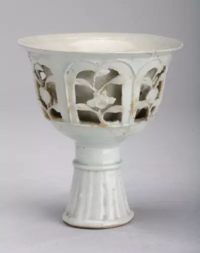 1984年扬州市老虎山西路出土。杯口外撇,深腹,喇叭形高圈足,挖足较深,杯身与圈足分制黏接。杯身为双层结构,内口沿印回纹图案,外壁腹部镂雕牡丹、梅花、菊花等折枝花卉图案。镂雕部位外侧堆贴由连珠纹组成的莲瓣纹饰。圈足中部有一道横弦纹,其下至底饰一周竖弦纹,排列规整,精细匀称。施白色釉,釉色莹润。胎质细密洁白。此杯系景德窑烧制精品,具有较高的艺术欣赏价值。