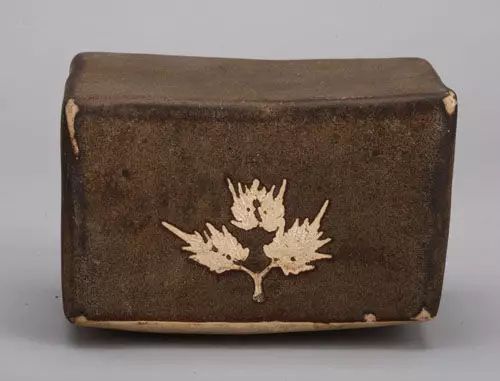 1980年东风砖瓦厂出土。枕作长方形,枕面两端稍高,面微弧凹。枕件中空,侧壁有一圆形小孔。前后壁各贴一片枫叶,再施灰褐色茶叶末釉,烧结后形成露胎的枫叶图案。枕底露胎,胎灰白细腻。