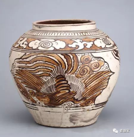 1971年扬州市漕河岸出土。罐直口,溜肩,球形腹,腹下部渐收,玉璧形砂底。器内满施酱釉,器外在白釉上绘褐花。肩部绘凤纹和花叶纹带,腹部两面如意形开光内绘一展翅飞翔的凤,周围填卷云纹,开光之间饰菊花纹。彩绘用双钩平涂和实笔点画结合的笔法,以深褐色勾线,以浅褐色渲染。罐体硕大,胎质厚重,图案线条流畅,风格豪放,是元代磁州窑代表作。