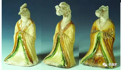 1984年扬州市农业科学研究所出土。此为十二生肖俑中的3件,分别为酉鸡、辰龙、午马。俑作站立状,均塑着兽首人身,身着交领广袖拽地长袍,双手平交于胸前,扎束腰带。头部未施釉,露白胎,外衣施淡黄色釉,内衣领、袖口等处饰褐彩和绿彩釉,釉色明快,配置协调,富有层次感。