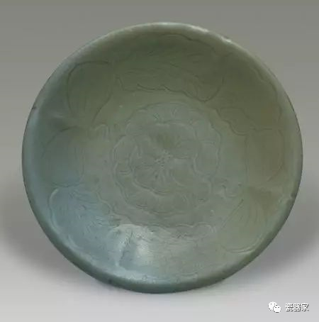 1981年扬州市月明轩工地唐墓出土。盘四瓣葵口,口沿外撇,浅腹,矮圈足。胎色灰白,胎质细腻。满施莹润的青绿色釉。盘内刻划花纹,中心为两瓣对称的荷叶纹,周边围绕6片荷叶。刀法细腻,线条自然流畅,是越窑生产的精品。