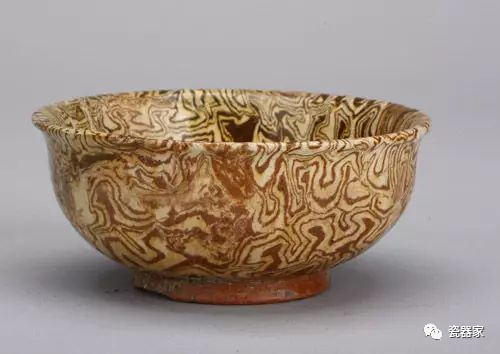 1990年扬州市汶河北路信托大厦工地出土。绞胎碗敞口外撇,圈足底。此碗是用褐色和白色两种颜色瓷土相间糅合,经过拉坯成型,施淡黄釉焙烧而成。唯圈足胎色单一。绞胎是唐代陶瓷制作的一种新工艺,此碗纹理变化多端,线条犹如行云流水。