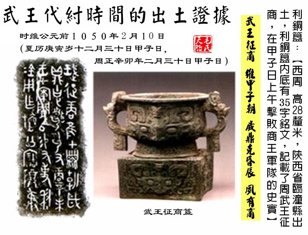 今本《竹书纪年》较古本添加了很多夏商周各代列王元年的岁名干支,张培瑜先生研究后认为,所增数值主要取自《大衍历议》,盖是唐宋以降后人所为。哲考证后认为,今本《纪年》或源自一行等历算家据唐初尚存的古本《纪年》用以校验历法的底本。且“命九侯、周侯、邘侯”是在帝乙时,故可断“元年己亥”帝辛即位,盖是唐历家误添岁名所为。细检今本《纪年》,文王继位(文丁十二年,原注:周文王元年)到(帝辛)四十一年去世恰五十二年,而武王庚寅伐商上距文王受命为周侯亦恰为五十二年。武王奉文王木主伐商,自称太子发,是武王克商前未曾改元的明证。那么武王所奉正朔自然是文王纪年而非帝辛纪年。(此为哲之独家发现,海内外学子并无一言以及,严谨剽窃。)文王初继位(时称周公昌),即立志为父复仇,古本《纪年》载:“帝乙二年,周人伐商。”帝乙十祀,十五祀有过两次征伐"人方"的战争,是殷末发生的规模较大,历时较长的战争。鉴于当时的形势以及季历被无辜诛杀的内疚,帝乙对周人采取了和亲的政策并任命西伯昌为周侯。易有帝乙归妹卦,诗有大明思齐篇,皆传颂大邦有子太姒归周之事,绝无虚妄。据文王十三年生伯邑考、十五年生武王发,文王娶太姒盖在文王继位十年或十一年,而帝乙命周侯亦在帝乙十一年。诗经大明篇:“有命自天,命此文王。”叙说的或即指此事。这就能很好地释解了“文王受命惟中身”这个历史疑案。据哲考证,文王在位五十一年,寿七十九(虚岁八十)(见拙作《周文王生卒年考》)。西伯昌受命为周侯正是在文王四十岁时。周人讲受命,根据情形有多种不同含义。受天子命为侯,亦是其中一种。若克商后周人习讲的文武受天命代商而王,那至少在太姒作程窹之后。若周代彝器毕克鼎铭就有“受命毕公”句,总不能理解为毕公受天命吧。清华简《程寤》记载,文王妃太娰做了一个梦,商代朝廷中长满了荆棘,她的儿子发,也就是后来的周武王,把松柏这些常青植物移植到商廷中,代替了荆棘,史祝解释为“周将代商之兆”,这就是著名的太姒之梦。但《程寤》首句“隹(惟)王元祀貞(正)月既生霸”后人很难理解,有的学者认为这是文王已称王的证据。在哲看来,此篇中的王,属于史官对文王史迹的追述,发生的时代显然是在文王任周侯期间。今本《竹书纪年》载:“二十一年春正月,諸侯朝周。伯夷、叔齊自孤竹歸于周。二十二年冬,大蒐于渭。二十三年,囚西伯于羑里。”哲以为,夏历正月无须冠名春字,殷历正月乃在夏历十二月,此“春正月”乃周人特称,可以表明此年文王已改历朔。“諸侯朝周”表明文王实际已然称王。故次年纣王大蒐于渭,后一年就囚禁了文王。史载“至纣六祀,周文王初禴于毕。”这是文王对先祖上帝以禴礼祭祀。可见,文王受命周侯期间,在帝乙去世后,不但颁行了周历,有了自己的纪年,也仿商王室行祭礼。正是因姬昌在毕地初禴(春祭曰禴,禴祭乃古代君王才有资格行的祭礼),僭越礼制有称王非分之心,故为纣王不容,将其拘押到羑里。为此可推而论说,太姒程窹或发生在周侯二十年之前。商纣王“囚西伯于羑里”与“纣六祀周文王初禴于毕”或为同一年事。那么帝乙去世必在周侯二十一年之前。以武王克商为历点上溯,周侯二十一年实为文王在位三十一年。商纣王“囚西伯于羑里”在辛酉年(前1080),则帝乙去世年最有可能在乙卯年,帝辛元祀则在丁巳年。以此推算,则商纣王“囚西伯于羑里”是在帝辛五祀,而《唐书历志》:「至纣六祀,周文王初禴于毕。」看似文王在帝辛六年还能主持祭祀,貌似和史实不合。哲案,年祀有别。看似有差,实际契合的很。今本《纪年》:“六年,西伯初禴于畢。”商祀皆在岁终,帝乙去世在乙卯年,则帝辛元祀严格说应该是在夏历丙辰年的岁终。以周正言,商纣五祀,才是帝辛六年。因为年、祀纪年法固差一年,和哲以前考证认定周武王十二年灭商和“十三祀王在管”所记事为同一年的判断契合。从中也可以看出,前商王去世后一年,亦可称为后商王的元祀年。但若依据商初太甲元祀例,则商王去世后一年皆归诸前王。既然今古本《竹书纪年》史官纪年皆以周正,那当以周年为说才是。今本《竹书》将“西伯初禴于畢”错系到(周侯)六年是整理者未能明白此五十二年非帝辛纪年,乃文王纪年。《唐书历志》写作“至纣六祀”是据竹书原文有“六年”,误改周年为商祀,殊不知商祀、周年各有别。故可以论定帝乙去世年必在乙卯年(前1086),帝辛即位在前1084丁巳年。依据殷周日名死年天干说,结合哲所考定的武王克商年日结论,已然可轻松将商末五代王即位年、去世年、在位年数排出如下:庚丁,前1167年-前1160年,