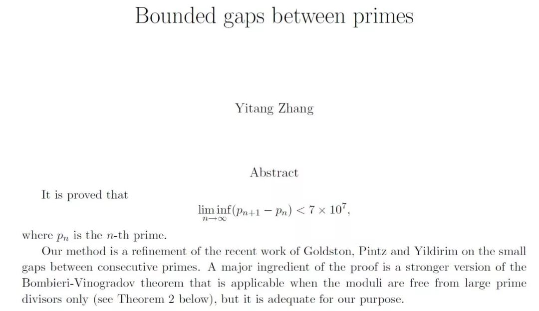 2013年,他证明了:存在无穷多对质数,它们的间隔小于7千万。