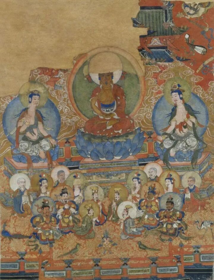 当时在供养人捐赠的壁画中,最广泛和最受欢迎的是,基于普拉尼德系的画。“普拉尼德系”,梵文意思为“誓愿”,这是跟随佛陀的承诺。佛陀画像占据图的中心,他是西方极乐世界的主人,在那里每位真正的佛教徒都试图找到的庄严清净、平等极乐之世界。壁画也表现了当地统治者对菩萨阿弥陀佛的崇拜,说明统治者将遵循佛教教义的所有要求,并承诺在他统治的国家支持和发展佛教教义。