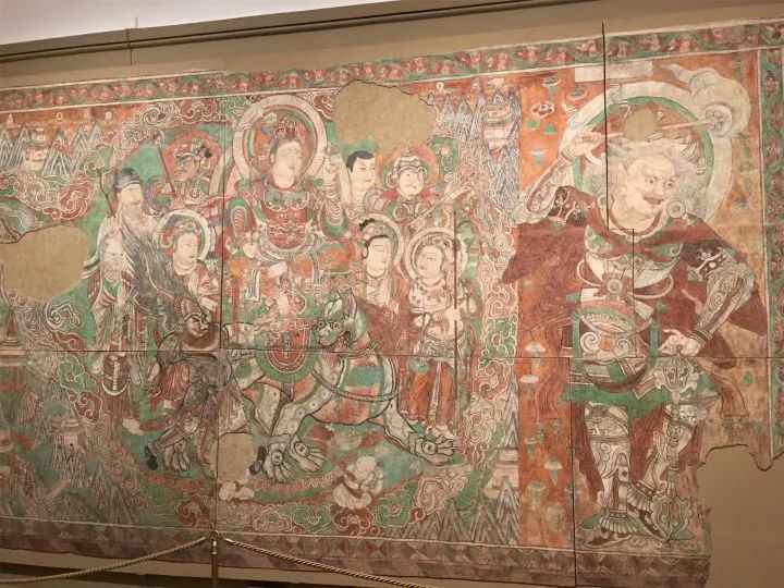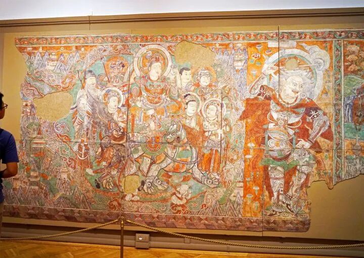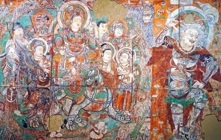 中国文物4:西域壁画1《文殊菩萨出行图》,11世纪,吐鲁番柏孜克里克石窟壁画冬宫展出的中亚千佛厅系列壁画,画面最大的就是这幅《文殊菩萨出行图》,高232厘米,长339厘米,从柏孜克里克石窟中最大的洞里切割而来,工作人员花了很长一段时间,才设法翻新了整幅壁画。