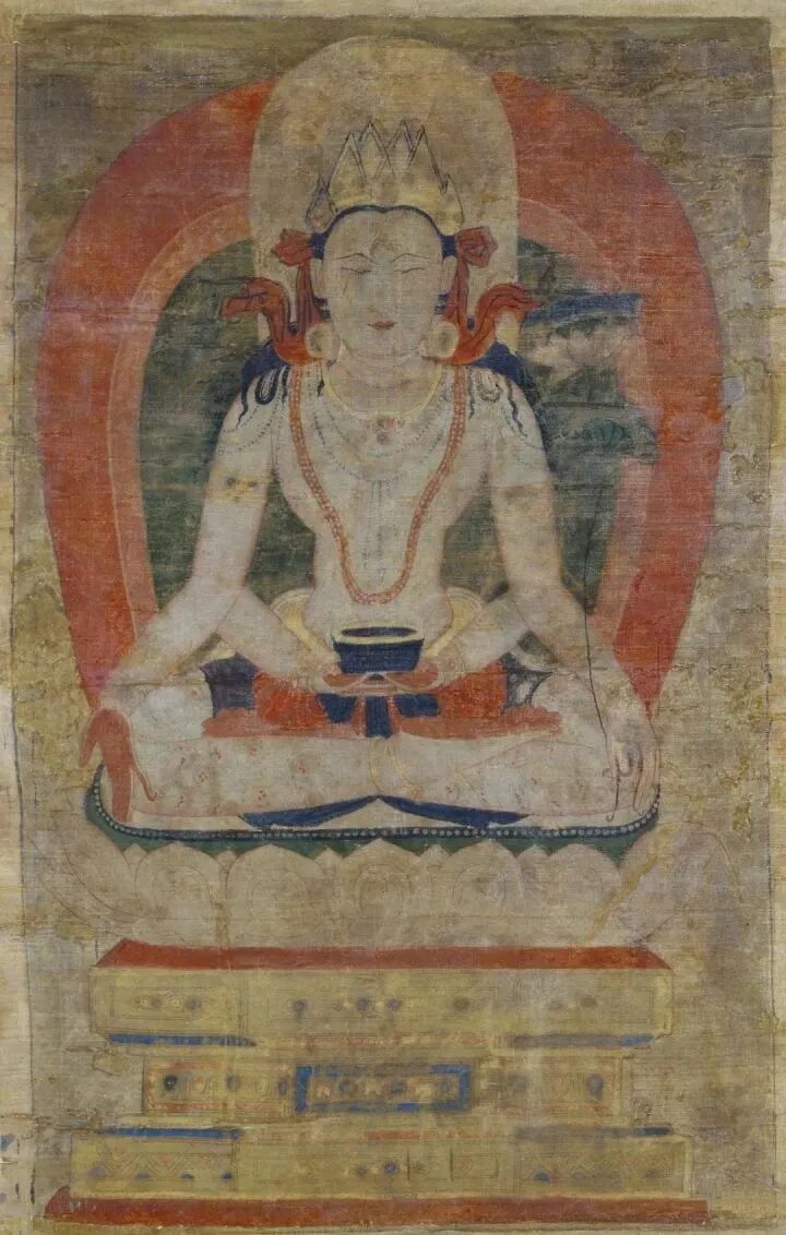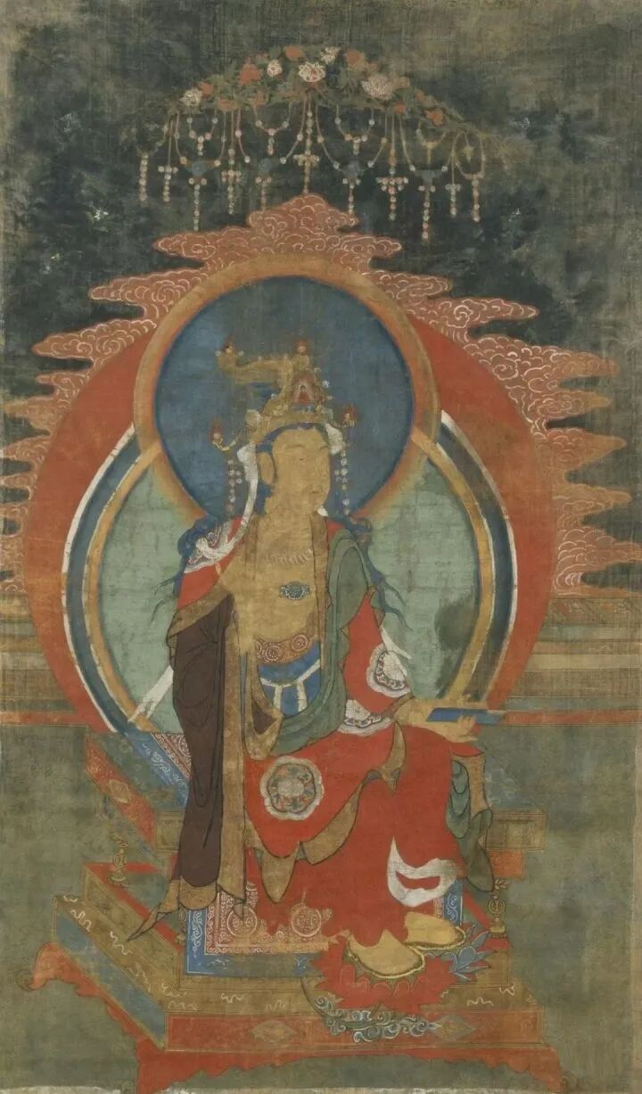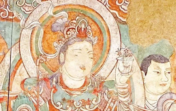 中国文物4:西域壁画1《文殊菩萨出行图》局部2:文殊菩萨一手持如意,一手托透明盏
