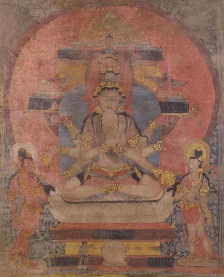 中国文物5:唐卡:藏密菩萨:多臂多头菩萨,背景是成排密教神众