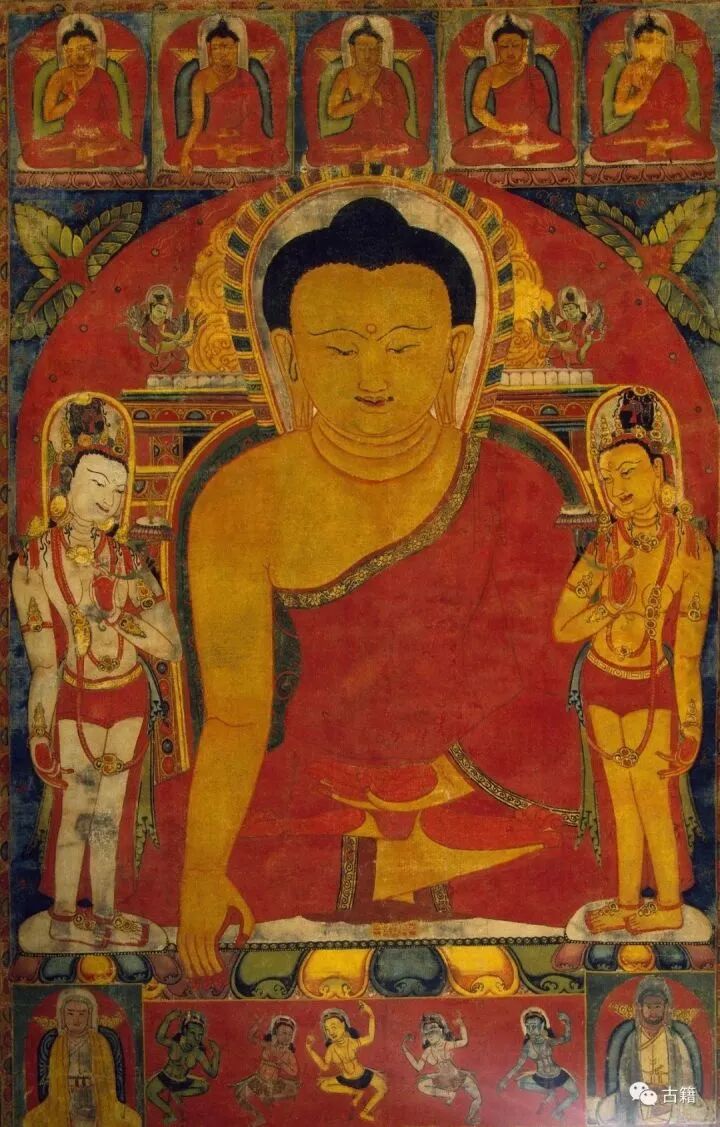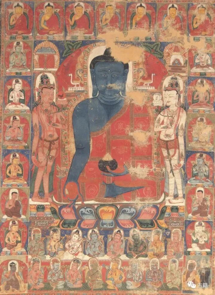 中国文物5:唐卡:藏密佛菩萨7:佛菩萨,环绕成排小佛,左右下角是弟子