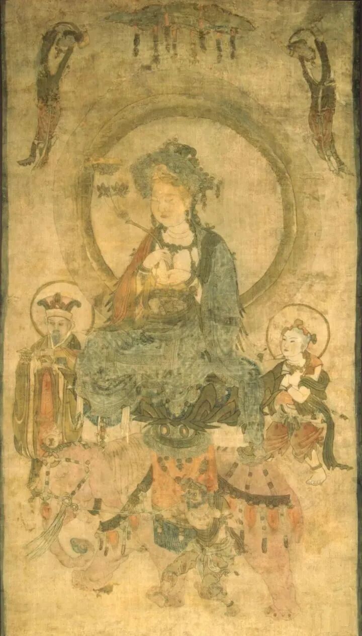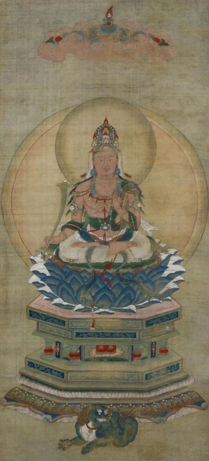 《文殊菩萨出行图》描绘了文殊菩萨率领眷属去赴华严法会的出行图。文殊菩萨骑坐于青狮上、华盖下,半侧面交脚而坐,头上有圆光,身后有背光,仪态雍容,天衣璎珞,装饰华丽,左手执樱花瓶,右手执如意。