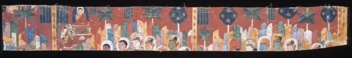 《佛说法图(誓愿图)》,11世纪。高227厘米,宽370厘米。中央为佛陀立像,微侧身,前后有菩萨弟子多人。左上部画着一座中国式楼阁,可见唐代以后,吐鲁番一带的壁画深受汉画影响。据说,这是新疆吐鲁番柏孜克里克壁画最常见的一种说法形式。