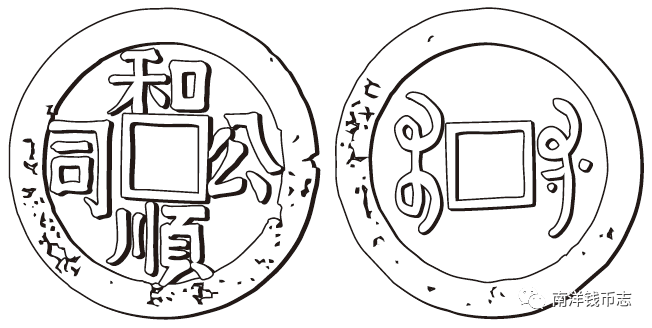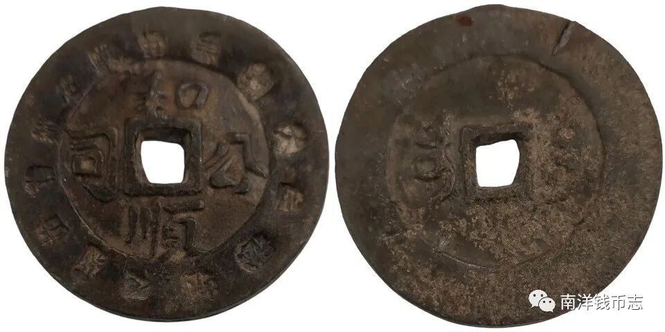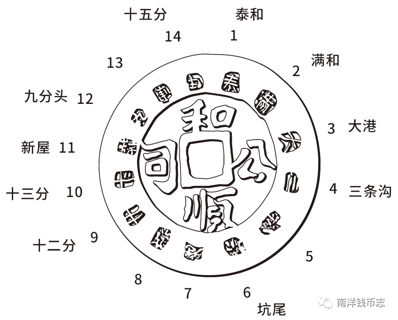 这种大型和顺公司锡币约铸造于1780年至1808年之间。面文和顺公司的周边有14个华文单字或符号,根据资料指出这是代表组成联盟的14家采矿公司。我自己检视比较后大致可以认出10家公司在币面上所处的位置。