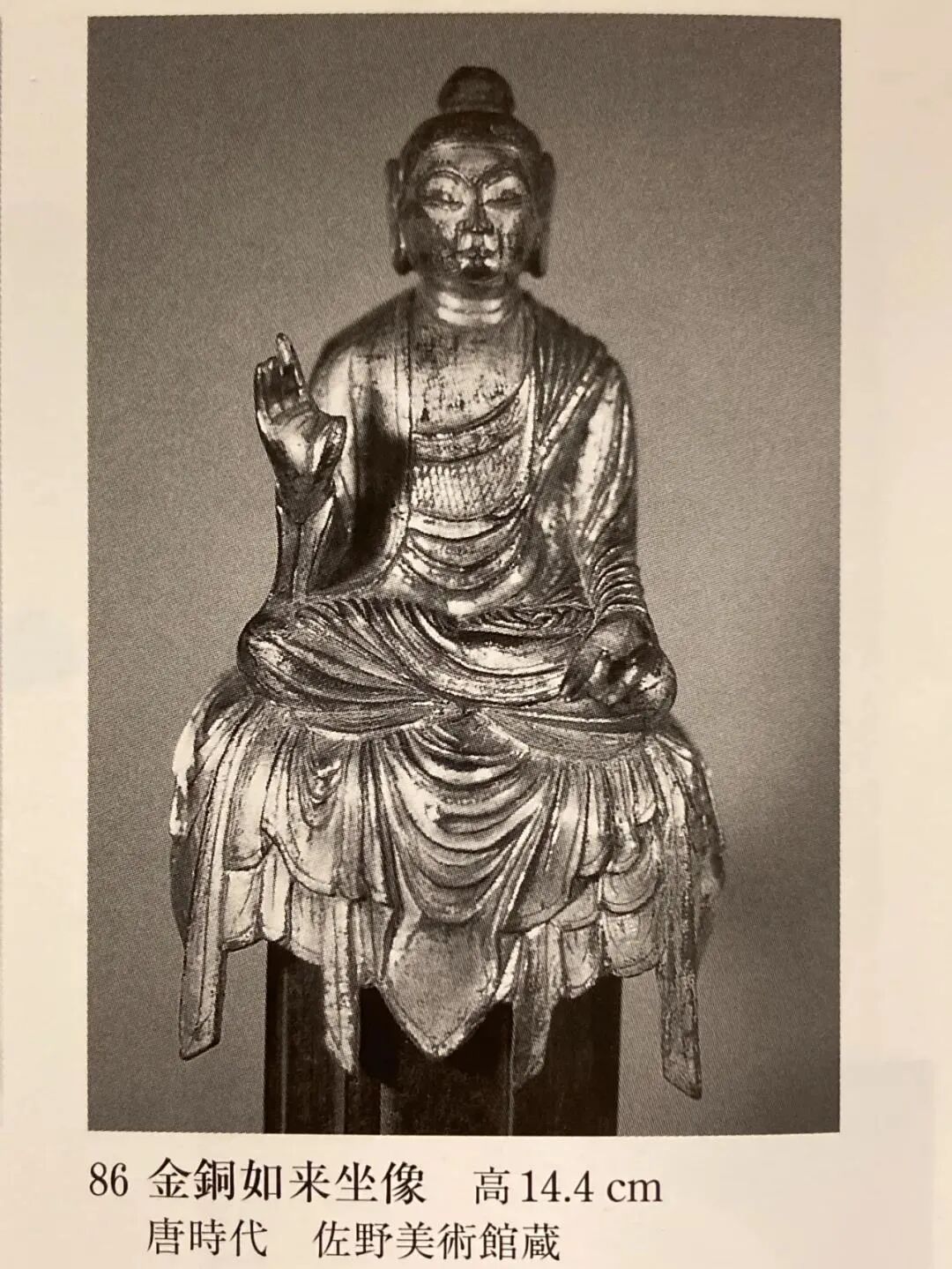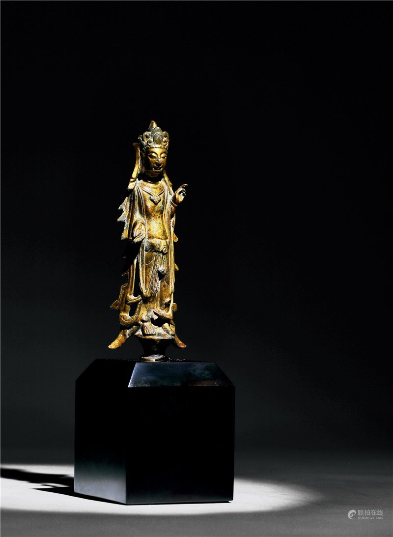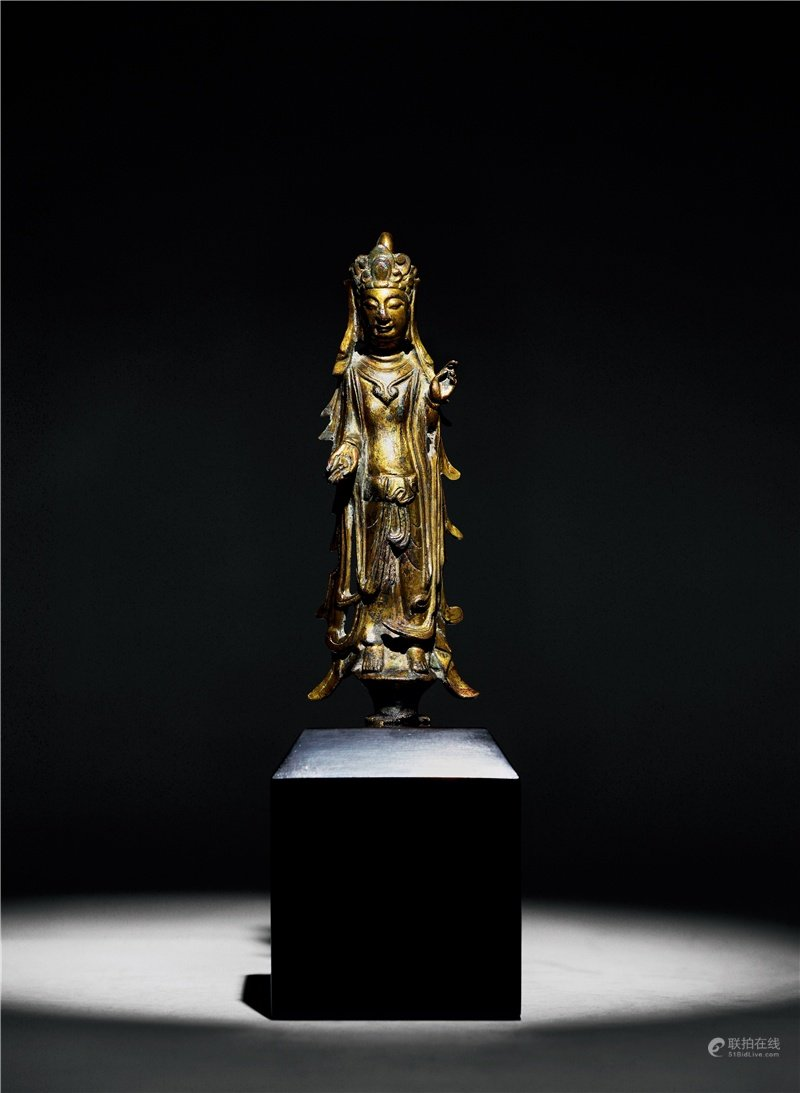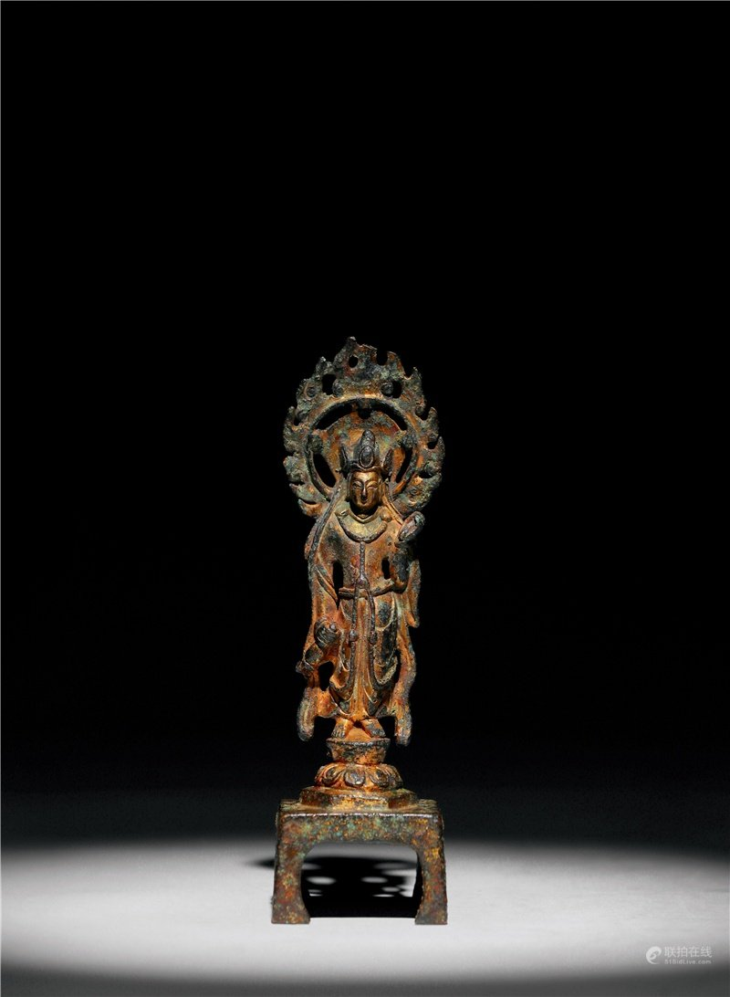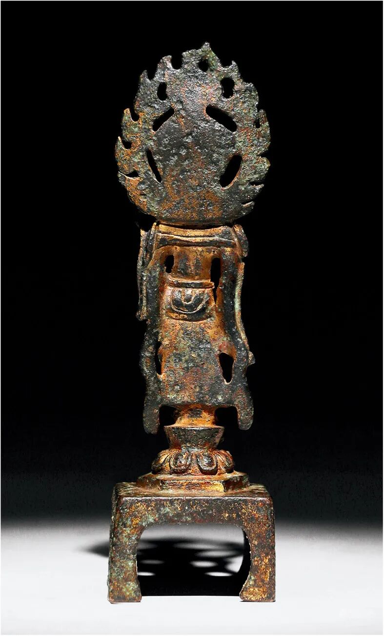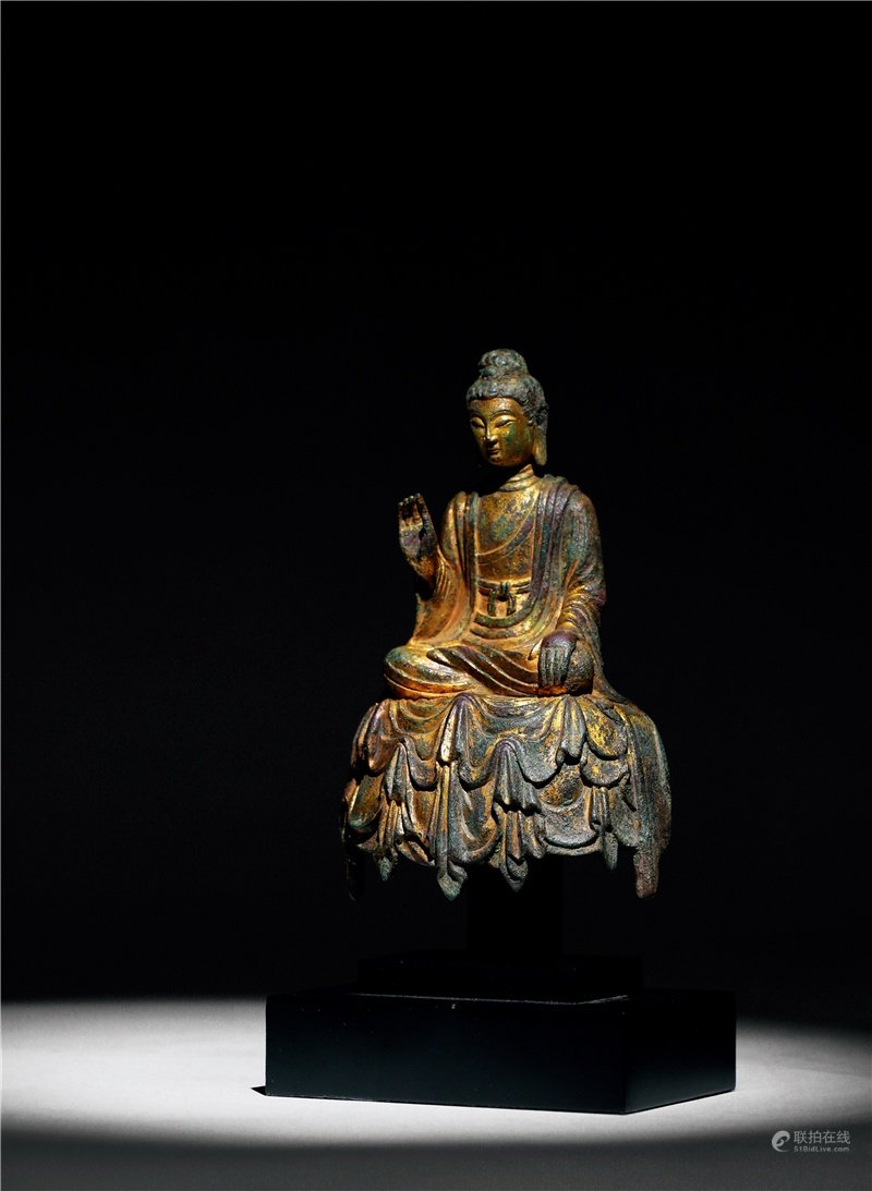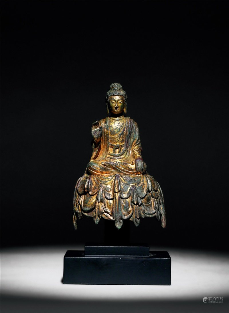 本品于铜胎上施鎏金,灿烂的鎏金表面经历悠久岁月而显现出斑斑锈迹,洋溢着独特的古韵。像呈螺发肉髻,面部丰盈,眉清目秀,眼角吊起,特征上已颇具汉化后的中原造像风格。匀称的身躯上披覆僧却崎,右手上抬至胸前结施无畏印,左手于膝前结与愿印,双足盘起全跏趺坐,长长的衣裾层叠覆盖,从台座如瀑布般垂下,华美绚丽,展现唐代佛教造像中颇为经典的裳悬座形式,至今日则已极其罕见。
