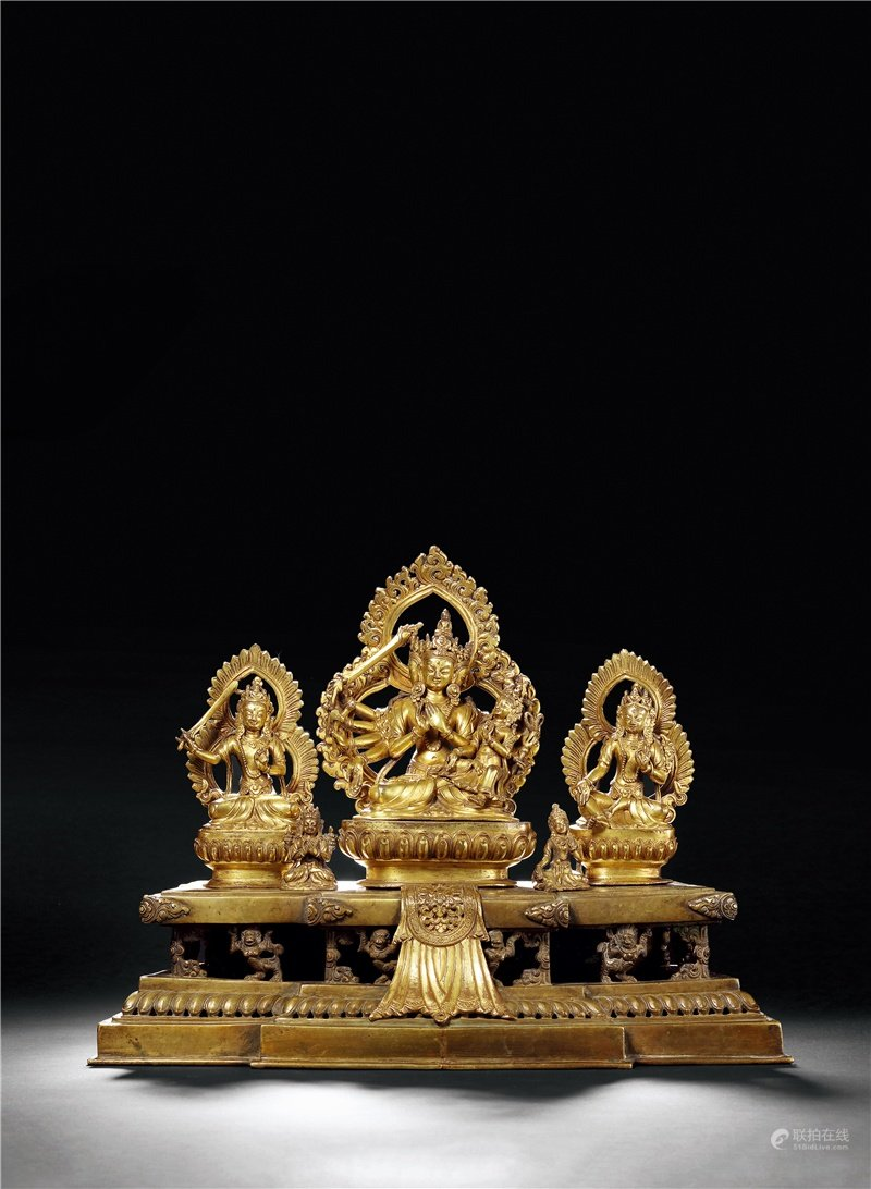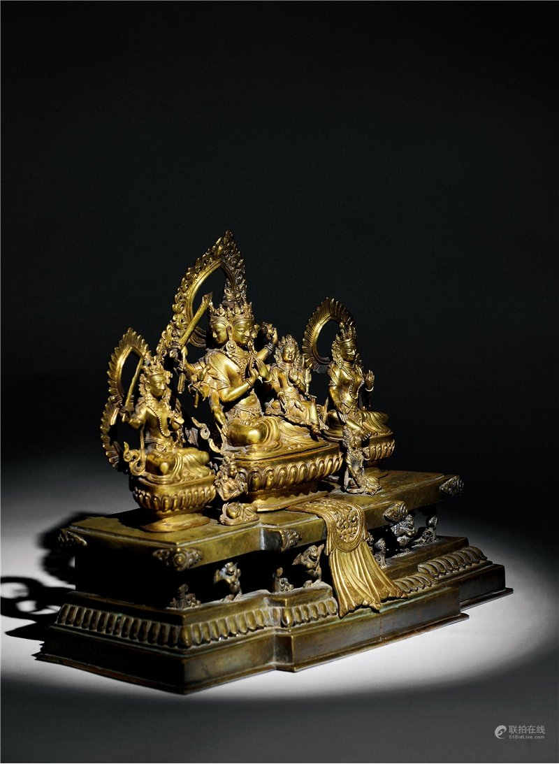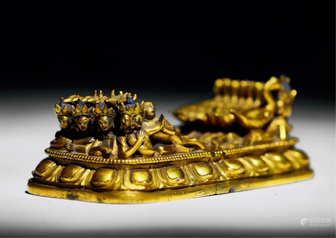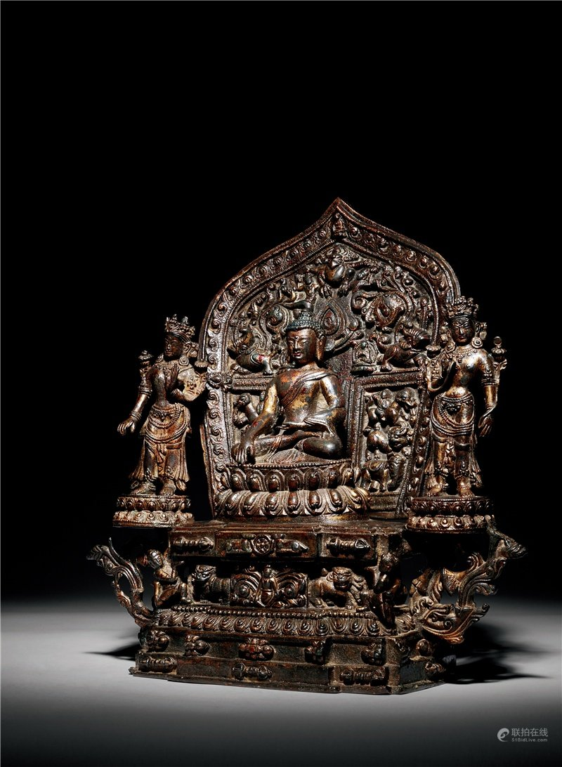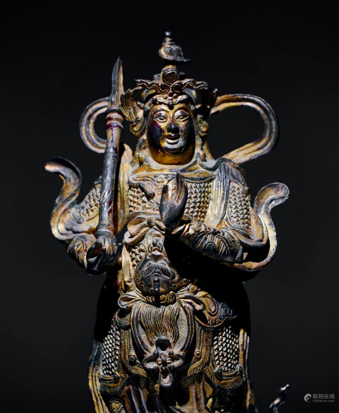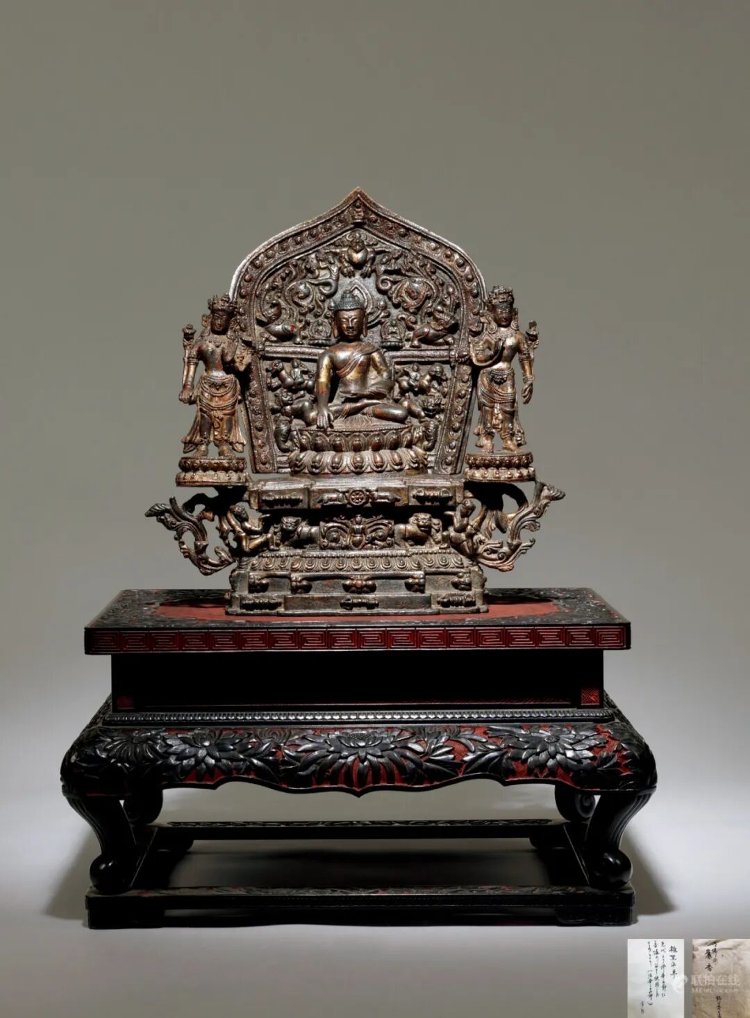 本品于铜胎上施鎏金,灿烂的鎏金表面经历悠久岁月而显现出斑斑锈迹,洋溢着独特的古韵。像呈螺发肉髻,面部丰盈,眉清目秀,眼角吊起,特征上已颇具汉化后的中原造像风格。匀称的身躯上披覆僧却崎,右手上抬至胸前结施无畏印,左手于膝前结与愿印,双足盘起全跏趺坐,长长的衣裾层叠覆盖,从台座如瀑布般垂下,华美绚丽,展现唐代佛教造像中颇为经典的裳悬座形式,至今日则已极其罕见。
