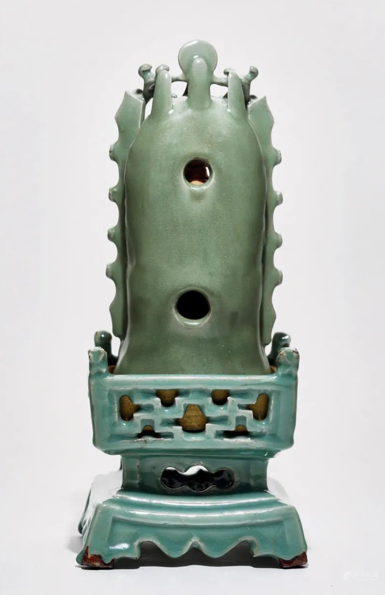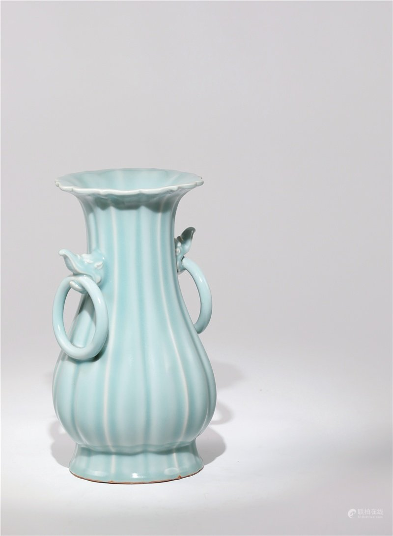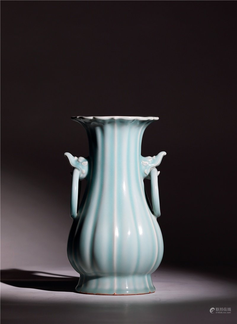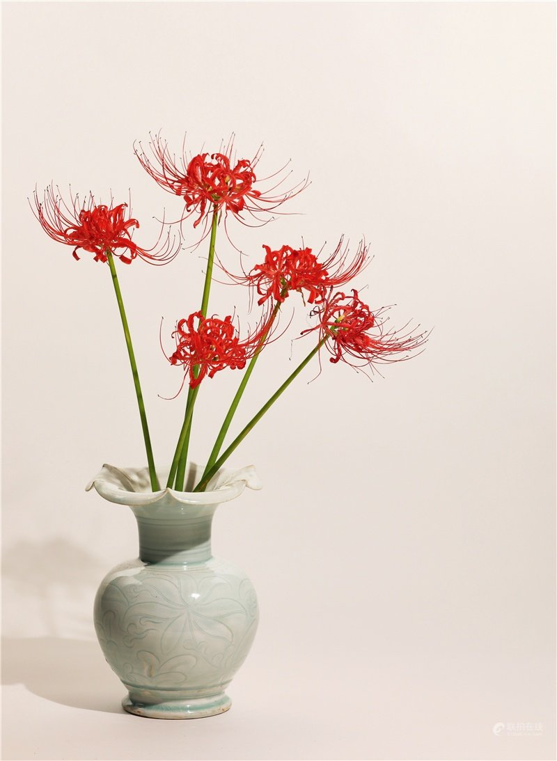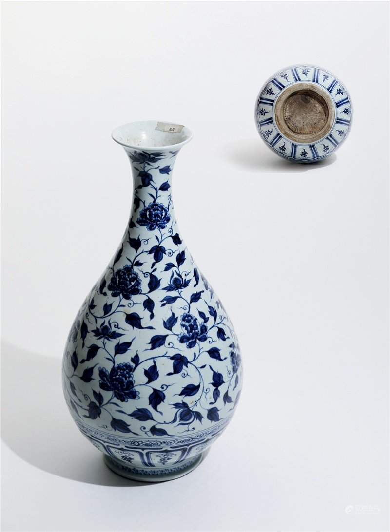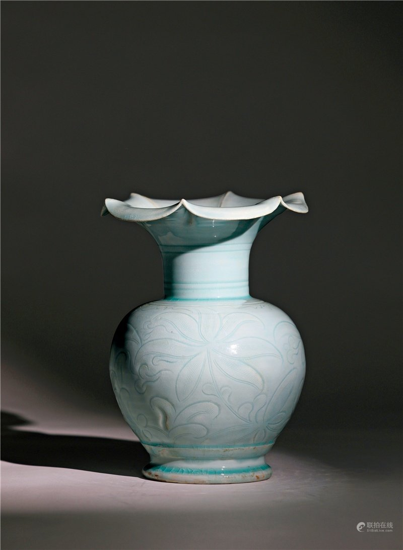 本品口沿呈花形绽放,花瓣之间有花茎相隔,萎角分明,自然展开。颈部内束,下接圆鼓腹,腹下部收敛入足,整体器形宛如一束鲜花盛开在花瓶之中,优美大方,亭亭玉立。全器施影青釉,釉色近白,积釉处显出淡淡的青色,极具透明感,晶莹光润美不胜收。颈、肩处环绕数道弦纹,瓶腹暗雕十几朵大小不一、花期各异的花卉,构图洁净素雅,仿佛阆苑仙葩来到人间,清新脱俗。