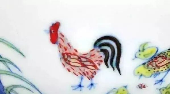 此杯再现了成化斗彩的彩绘风格,绘画生动传神是其最为人称道之处,画面上雄鸡昂首啼鸣,雌鸡低头觅食,3只雏鸡振翅追逐其后,雄鸡、雌鸡、雏鸡各具神态,观其形仿佛能闻其声。旁边绘衬青绿山石、红艳牡丹、幽靓兰草,一幅宁静的田园景色扑面而来。