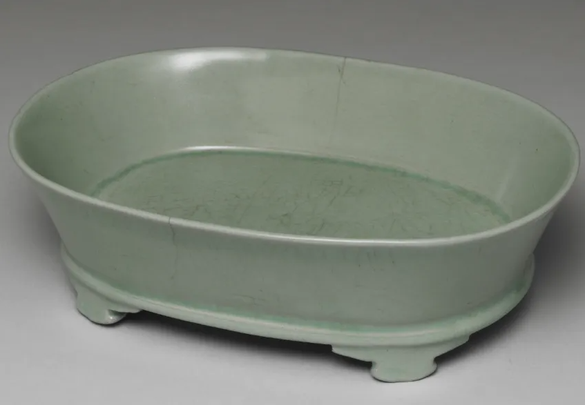 传世目前可见六件汝窑水仙盆,其中有四件典藏在台北国立故宫博物院,一件收藏于日本大阪市立东洋陶磁美术馆,一件收藏于中国大陆吉林省博物院。而这件水仙盆是目前传世汝窑中唯一无开片纹路者,可视为明代鉴赏家曹昭在《格古要论》中所说汝窑“有蟹爪纹者真,无纹者尤好”的最佳例证。