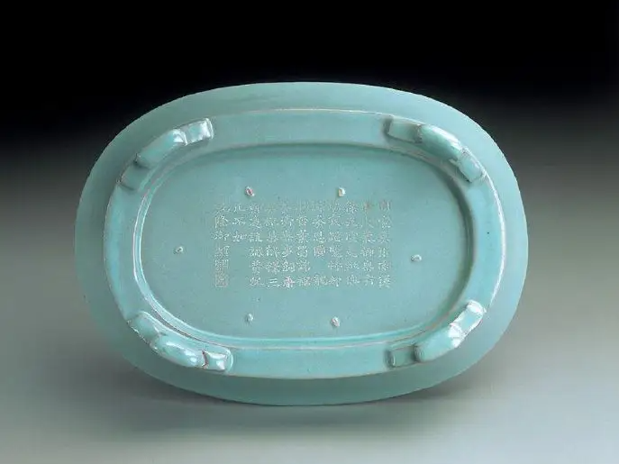乾隆帝鉴赏清宫旧藏瓷器之际,对此件作品摩挲把玩、爱不释手,降旨加刻御制诗并重新设计陈设木座。造型别致的木座带抽屉,屉内置《乾隆御笔书画合璧》册。