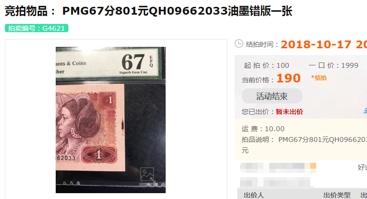 我们可以很清楚的看到,这张纸币的中间位置,有多余脏污痕迹。不少朋友看到后,可能会以为是小朋友不小心把墨水泼上去了,其实它是印制的时候,出现油墨错误导致的。评级币上也明确标注了“Ink Smear Error”。这种脏污是印钞油墨,和后天涂抹上去完全不同。 这张少见的50元纸币,就卖了3400元。值得一提的是,并不是所有油墨错误的纸币,都有这么大一块。 比如上面这张1元纸币,在右边就多了一块油墨出来,由于错误痕迹较小,所以市场价是190元。但相对面值来说,也涨了190倍。 无独有偶,还有另一张类似的油墨错误纸币,它的错误痕迹在左下方,成交价也是100多元。