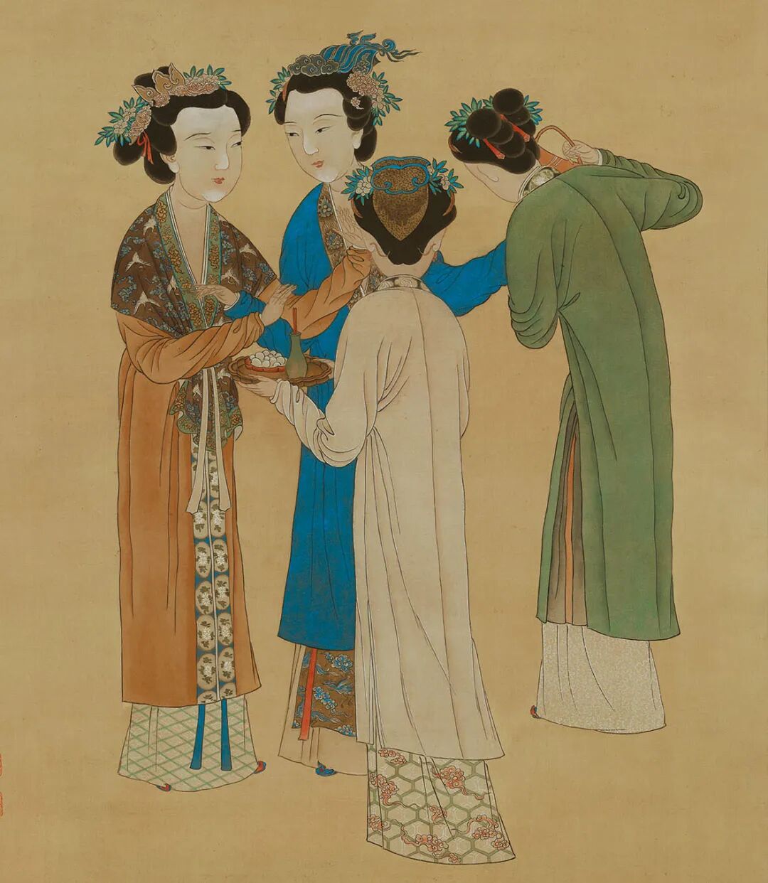 画面中有四位宫妓、宫女,她们正在整妆等待君王召唤。其中正面两位宫妓较为高贵,雍容华丽,光彩照人,头戴金莲花冠、青凰彩云冠与簪花头饰,身着云霞菊花彩饰的道衣。她们面施胭脂,体貌丰腴,脸蛋圆润,柳叶眉、凤眼、高圆鼻、樱桃小嘴,贵气不失娟秀,面态端庄而又娇媚。在近处的背向观者的两位宫女,头戴簪花头饰,没有冠子,发型为一般仕女造型,身材较为苗条。最右边身着绿色衣服的宫女提酒壶为身穿一件石青颜色大褂服饰的宫妓斟酒,身穿石青色服饰的宫妓面朝左边宫妓,示意其也喝一杯,身披丝巾的宫妓双手挥动表达拒绝之意。身穿一件淡黄色长褂的宫女双手端着果盘,盘上有一碟白色果子,和一内插一双红筷子的绿瓶。唐寅精心描绘了四个盛装的宫妓、宫女的神情状貌,神态举止被刻画得生动传神。四位宫妓、宫女平稳有序交错站立,并通过略弯的立姿、微倾的头部和交错相连的手臂,形成画面动态的变化和相互的紧密联系,表现了形象的丰富性和人物生动感。