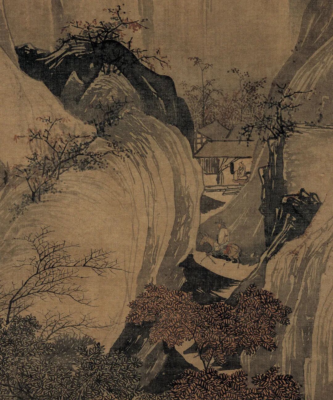 画中山路弯曲,崎岖不平,通行相当困难,但是路是人走出来的,因此,山路需要修栈道方便人车或马驴行走。此图左边的山岩下,唐寅画出曲折的山路,留白的路面旁边搭架栈道,唐寅以不规则曲折线条画木头搭架的栈道,前面的栈道墨色较深,线条细劲有力,远景的栈道画以淡墨,更显飘渺悠远。