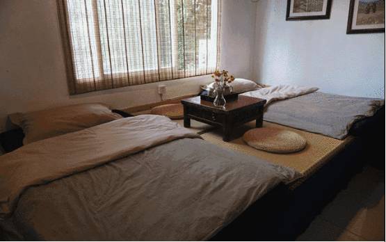 蒲团竹帘、原木小桌,