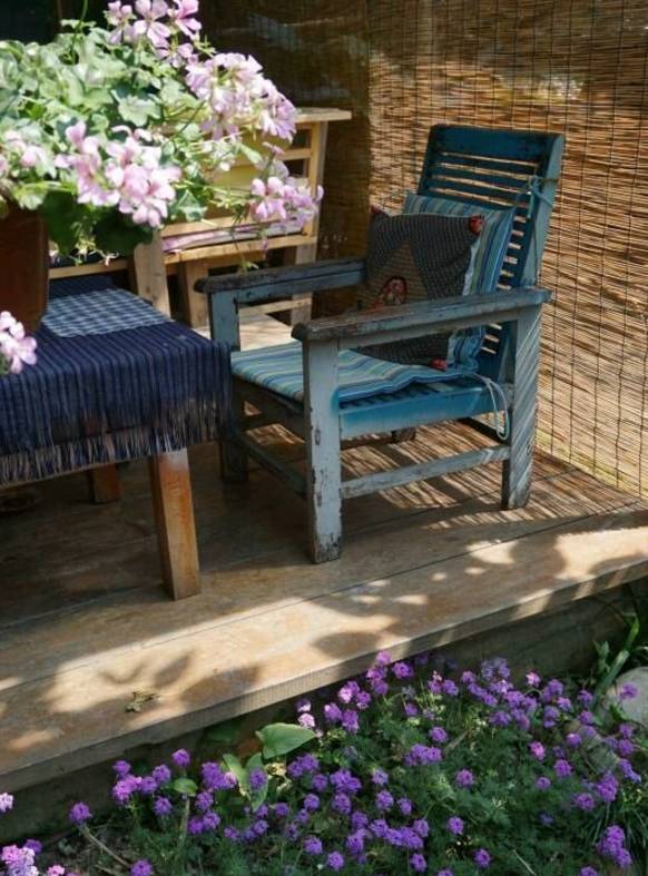 三姑把淘来的旧木桌、木椅放在树下,