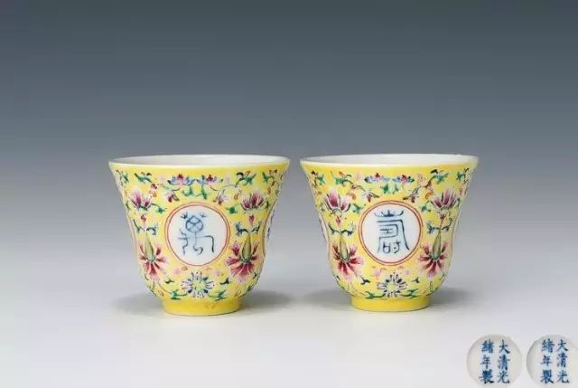 清 光绪黄地粉彩万寿无疆酒杯
