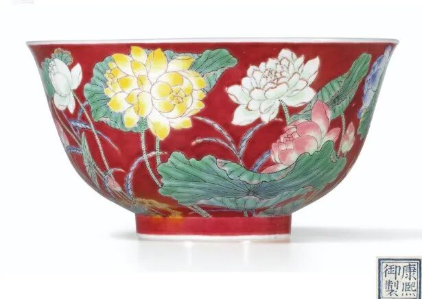 清康熙 御制胭脂红地珐琅彩莲花图碗