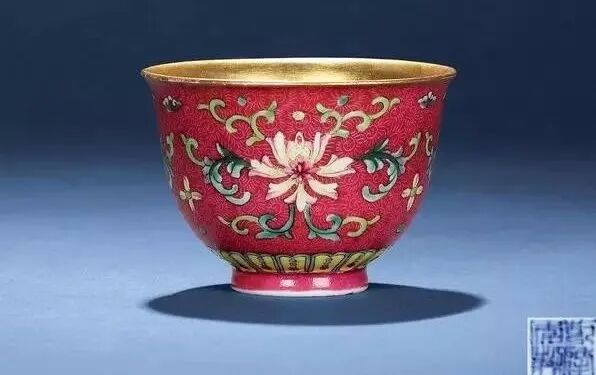 清 乾隆胭脂红锦地轧道洋彩花卉纹酒杯