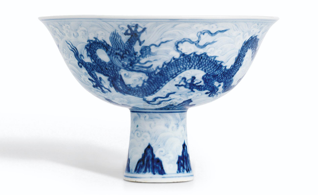 明宣德 青花暗花【海水游龙】图高足杯