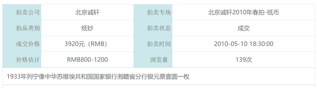 这枚1933年所发行的苏区货币,在2010年拍卖会上,就以3920元的价格成交。