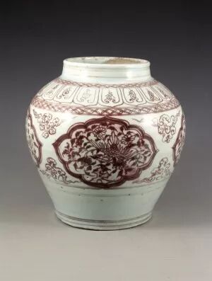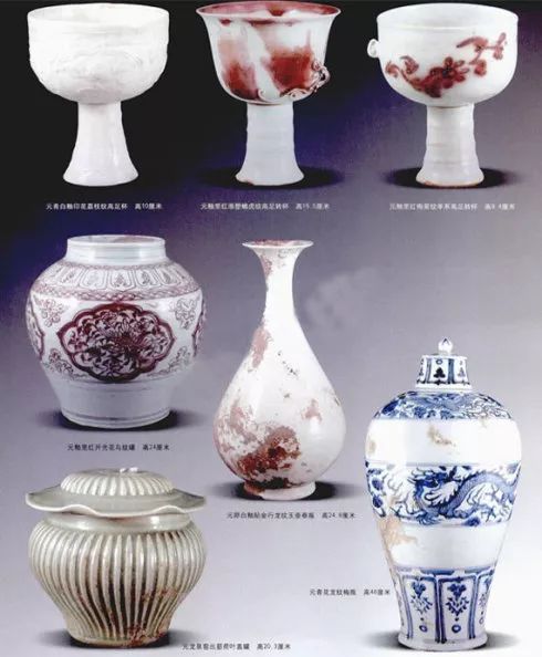 1980年11月,江西九江高安发现一元代窖藏,共出土器物245件,其中瓷器239件,这批出土的元瓷分属4个大的窑口:景德镇窑产品包括了19件元青花、4件釉里红及青白釉、卵白釉瓷,数量共68件(含事后追缴的一件卵白釉云雁纹印花大碗,这件追缴的大碗一般不列入窖藏瓷器),龙泉窑青瓷数量最多,达168件,此外还有钧窑系和磁州窑系的产品。