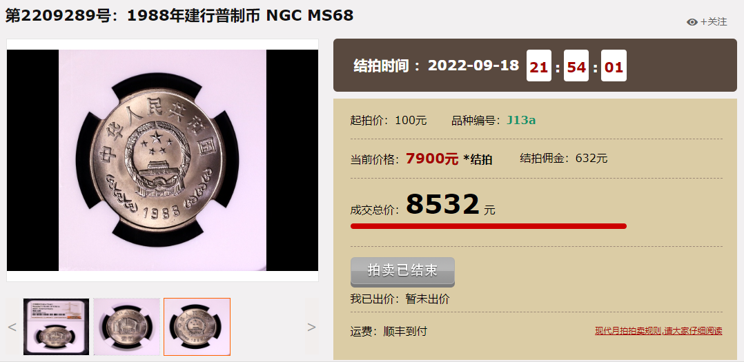 上个月在某拍卖网站上,一枚NGC68分的建行币以8532元的高价成交!
