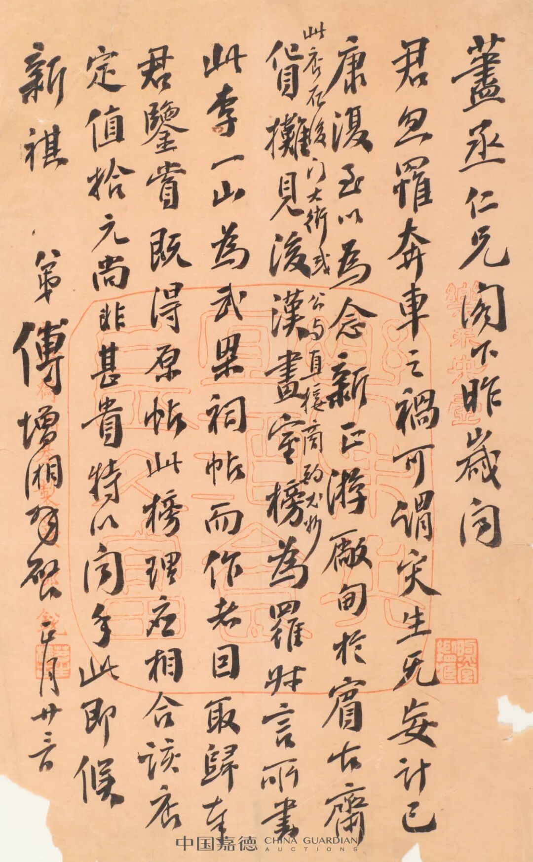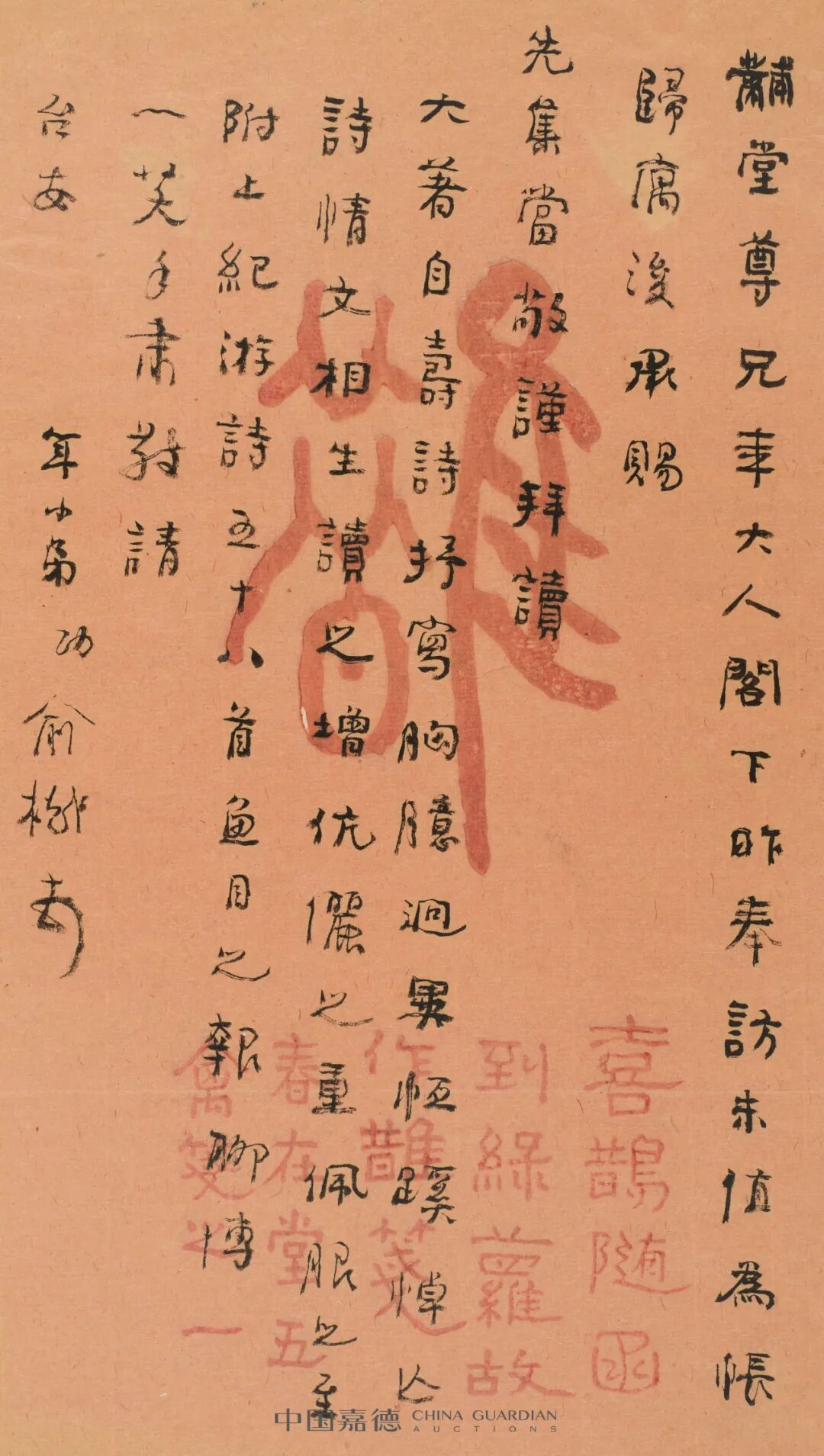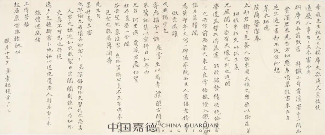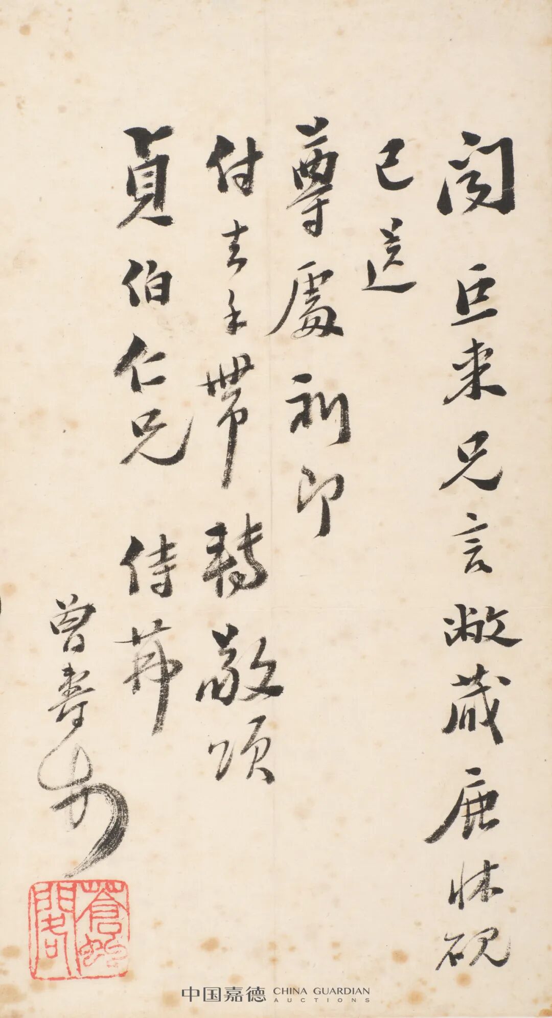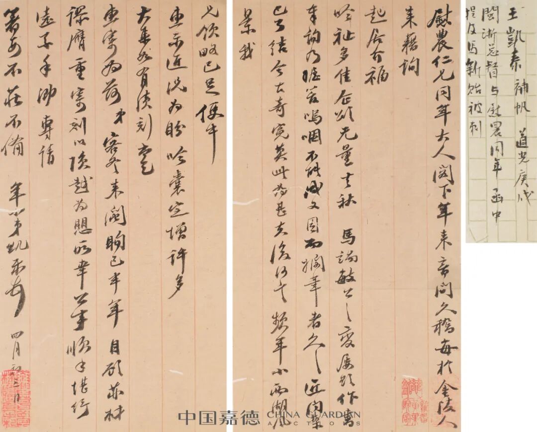 丁立诚(1850-1912),字修甫,号慕倩,晚号辛老、莘老,浙江钱塘(今属杭州)人。清末藏书家、目录学家。清光绪元年(1875)举人,官内阁中书。以藏书闻海内,所收西泠八家刻印尤富,著有《小槐簃文存》《小槐簃吟稿》《永嘉金石百咏》等。另有许应骙、俞廉三、袁树勋、张人骏、叶祖珪、聂缉椝、杨士琦致同一上款人“守溪”书札一组7件,诸位多为晚清一方封疆大吏或中枢智囊。其中叶祖珪信中提及军火船只过关验收事宜;杨士琦信中谈及物价翔贵,各局经费紧张;其余几通均为拜贺之词。张人骏(1847-1927),字健庵、千里,号安圃,晚号湛存居士。直隶(今河北唐山)人。张佩纶侄,清末政治家,历官同治、光绪、宣统三朝。同治七年(1868)进士,授翰林院编修。后历任山东布政使、漕运总督、山西巡抚、河南巡抚、两广总督、两江总督等,在任时守卫了西沙群岛的主权。谥文贞。杨士琦(1862-1918),字杏城。安徽泗州(今江苏盱眙)人。清光绪八年(1882)举人,总办关内外铁路事宜,曾任邮传部长,辛亥革命后任熊希龄内阁交通总长。出身大官僚家庭,为李鸿章、袁世凯重要幕僚,素称“智囊”。还可见清末民初,出身行伍之高级将官、民主革命者徐绍桢、游凤池、杨子萱、商德全、穆葆善、贾德耀、焦曾宪(焦菊隐父亲)、徐克复、晏道刚、何文华等致同一上款“易谙”信札4件。16.5×25.8 cm、19×28 cm、19.3×26.5 cm徐绍桢(1861-1936),字固卿。广东番禺人,祖籍浙江杭州。明朝开国元勋徐达第14世孙。中国近代民主革命家,被孙中山誉为“中华民国开国元勋”,陆军中将,加上将衔。藏书甚富,在南京任职时曾筑藏书楼,至辛亥革命时已储书20余万册,惜被张勋焚毁。后再筑“学寿堂”藏之,晚年病居上海,致力著述,颇精版本及历算之学,著有《三国志质疑》《六书辩》《勾股通义》等。游凤池(1890-1960),字沛生。贵州贵阳人。民国间曾任中央军校、陆军大学教官,中将军衔。1949年在重庆参加起义,后任贵州省政协委员。亦有洋务运动代表沈桂芬、台北规划师王凯泰、金石名家潘祖荫、同光体浙派代表袁昶、日本权威汉学家内藤湖南、藏书家傅增湘、苍虬居士陈曾寿、浓墨宰相刘墉、文治总统徐世昌等学人名家书札墨迹,于金石碑版、经史文辞等领域各放异彩。沈桂芬(1818-1881),字经笙、小山。顺天宛平(今北京市)人,祖籍江苏吴江(今属苏州)。晚清洋务运动主要负责人之一。道光二十七年(1847)进士,历官内阁学士兼礼部侍郎、山西巡抚、军机大臣兼总理各国事务衙门大臣、兵部尚书,后加太子少保。逝后太子太傅,谥号文定。著有《粤轺随笔》《成均课士录》。王凯泰(1823-1875),初名敦敏,字幼徇、幼轩、补帆,号补园主人。江苏宝应人。道光三十年(1850)进士,后入李鸿章幕。历任浙江督粮道、浙江按察使、广东布政使、福建巡抚。同治十三年(1874)因沈葆桢奏请移巡驻台以协理外交之故,于光绪元年(1875)渡台处理台湾事务。逝后赠太子少保,谥“文勤”。著有《致用堂志略》《致用堂捐藏书目》《岭南鸿雪集》《台湾杂咏》等。薛时雨(1818-1885),字慰农、澍生,号桑根老人。安徽全椒人。清咸丰三年(1853)进士。太平军起,参李鸿章军幕。官至杭州知府,兼督粮道,代行布政、按察两司事。为台湾第一巡抚刘铭传亲家。晚清著名词家之一,作品有《藤香馆诗删》《词删》等。潘祖荫(1830-1890),字在钟,小号伯寅,亦号少棠、郑盦。江苏吴县(今苏州)人。清咸丰二年(1852)进士,官至工部尚书。通经史,精楷法,收藏金石甚富,是清代“吉金”鉴藏的关键人物之一。著有《攀古楼彝器款识》,辑有《滂喜斋丛书》《功顺堂丛书》等。12.7×22.7 cm、12.5×22.5 cm袁昶(1846-1900),原名振蟾,字爽秋、重黎,号浙西村人。浙江桐庐人。清光绪二年(1876)进士,历官户部主事、总理衙门章京、江宁布政使、太常寺卿。因直谏反对用义和团排外而被清廷处死,同时赴刑的还有许景澄、徐用仪等四人,史称“庚子五大臣”。《辛丑条约》签订后,清廷为其平反,谥“忠节”。同光体浙派诗人代表,著有《渐西村人日记》《安般簃诗续钞》等。张謇(1853-1926),字季直,号啬庵。江苏南通人。中国近代实业家、政治家、教育家、书法家,“江苏五才子”之一。清光绪二十年(1894)进士,主张“实业救国”,是中国棉纺织领域早期的开拓者。精擅书法,学颜而掺以欧阳率更。内藤湖南(1866-1934),本名虎次郎,字炳卿,号湖南。日本秋田人。日本中国学京都学派创始人之一,与严复、罗振玉、刘鹗、王国维、郭沫若、梁漱溟、张元济等中国朝野硕学之士等往从过密。精于中国古籍、书画等鉴赏,在中国史学史、美术史、目录学、敦煌学、满蒙史地等领域,也都卓有建树。著有《中国史学史》《近世文学史论》《支那美术史》等。傅增湘(1872-1949),字叔和,后改字沅叔,号润元,自属藏园居士、双鉴楼主人。四川江安人。清光绪二十四年(1898)进士,曾任翰林院编修、直隶提学使,创办北洋女子师范学堂及京师女子师范学堂,后任北洋政府教育总长、故宫博物院图书馆馆长。工书,善文,精鉴赏,富收藏,以藏书为大宗,世所闻名。遍交当时藏书大家,如李盛铎、缪荃孙、袁克文、陶湘、张元济、刘承干、叶德辉等人,其搜书之勤、藏书之富、版本之精,为近代诸藏书家之首。陈曾寿(1878-1949),字仁先,号耐寂、复志、焦庵,家藏元代吴镇所画《苍虬图》,因以名阁,自称苍